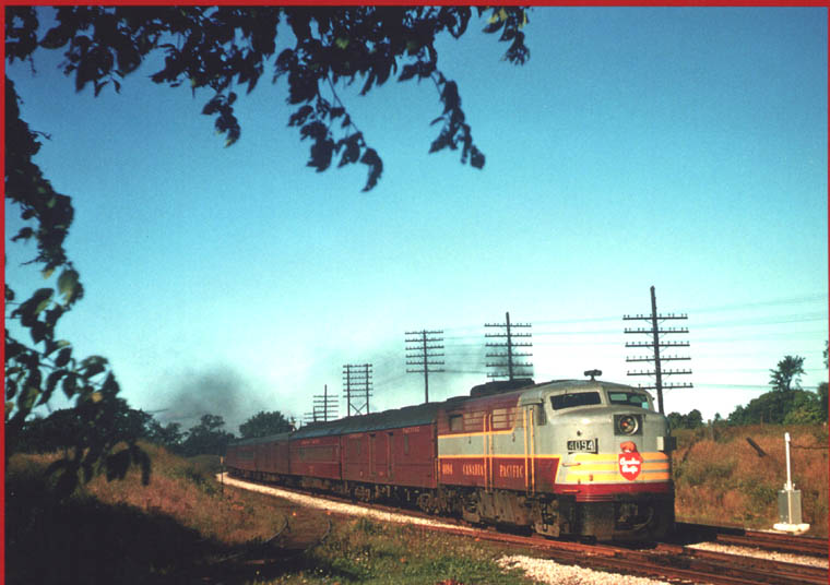 No.630 Eng. 4094 (MLW #79170 10-53) one of only seven Alco FPA-2 units equipped with steam generator for passenger service, shown here eastbound through Streetsville on Saturday, September 8, 1956. Robert J. Sandusky |