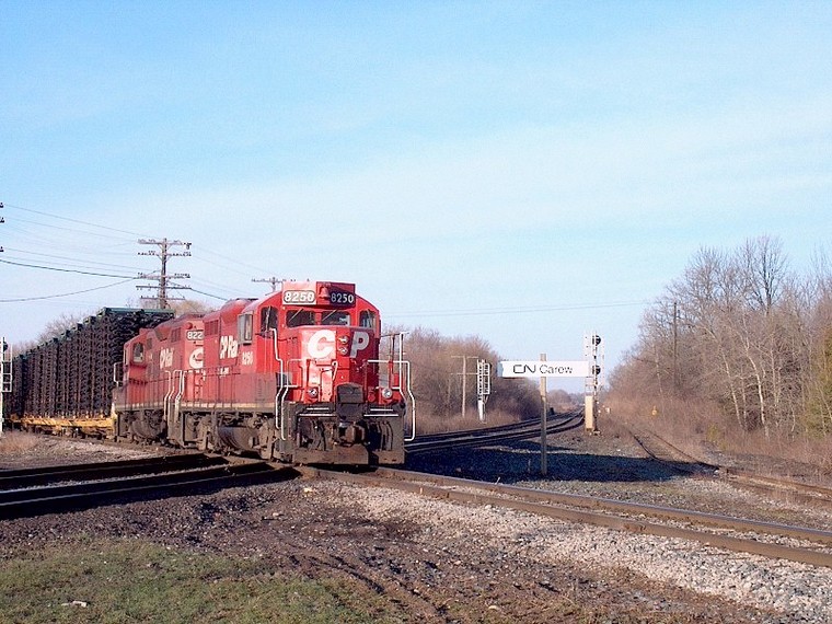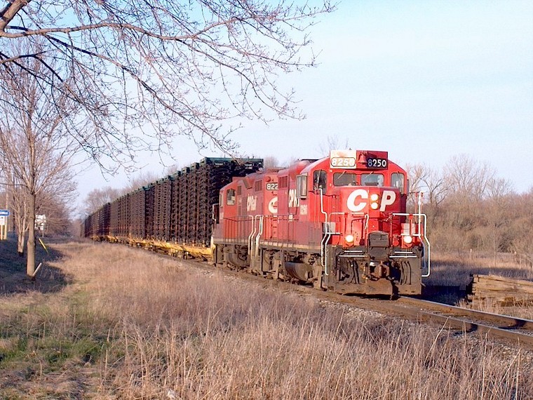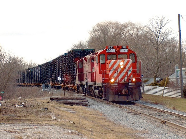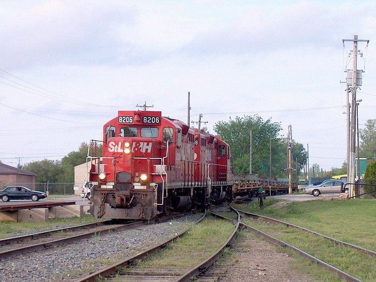 St.L&H 8206 leading train 141 through Ingersoll returning with empty flat cars. 3/16/2006 Walter Pfefferle