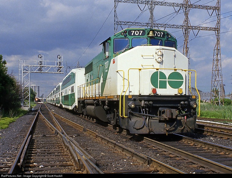 707 leaving westbound from Kipling station Mile 9.7 Galt Sub at Canpa. 6/20/1986