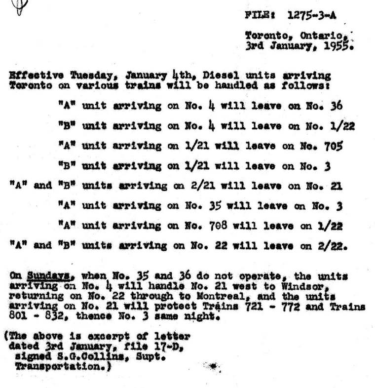 Beginning in late May 1954, dieselization of Montreal-Toronto trains by the CPR had resulted in the utilization of an interesting operational pattern for the units each night. Two units assigned to each of the two sections of trains 21 and 22 respectively, from Montreal and from Toronto. When the four units arrived in Toronto in the morning on the two sections of 21, two of them continued westbound as far as Windsor, Ont. One unit went to Owen Sound on train 705. The final unit returned to Montreal on day train 36. In the evening, the two units returned on train No. 22 from Detroit, and continued with the train to Montreal. The unit which went to Owen Sound on train 705 returned on train 708, and combined with the unit arriving from Montreal on day train No. 35, returned overnight to Montreal on the second section of train No. 22.