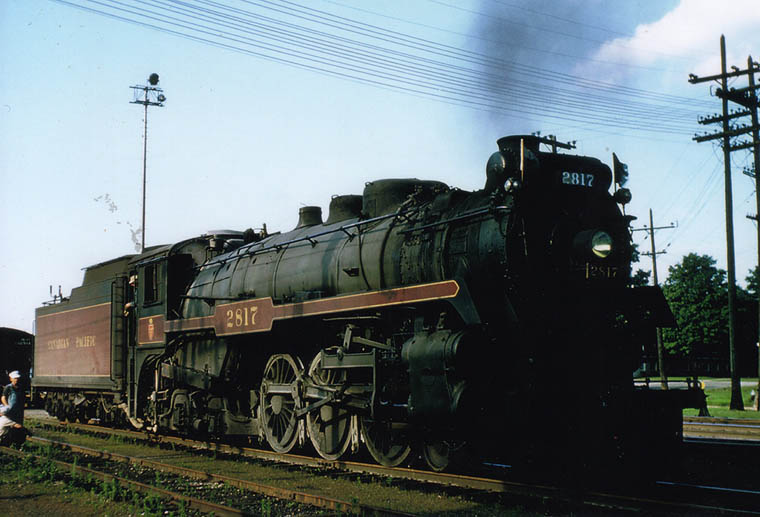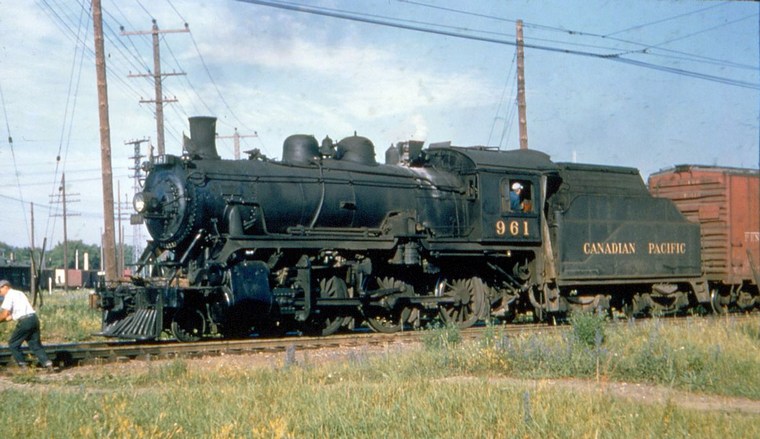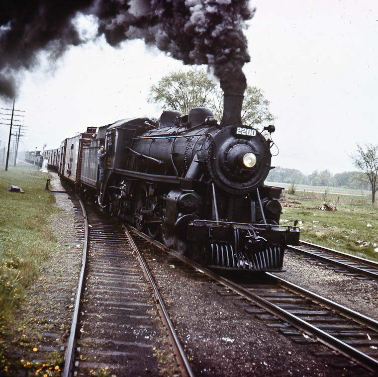 This great slide of G1 class 2200 with what is believed to be eastbound third class train 80 or 82 and apparently taken as it heads into the passing track at Ringold (Mile 70.9) on the Windsor Subdivision just west of Chatham around 1958-59. Excessive black smoke is a good indication of a stoker-fired engine. One of only three G1's (+ 2202, 2219) so equipped around 1950 following the early end of the G5 production. Robert H. Lorenz/Bruce Chapman Collection