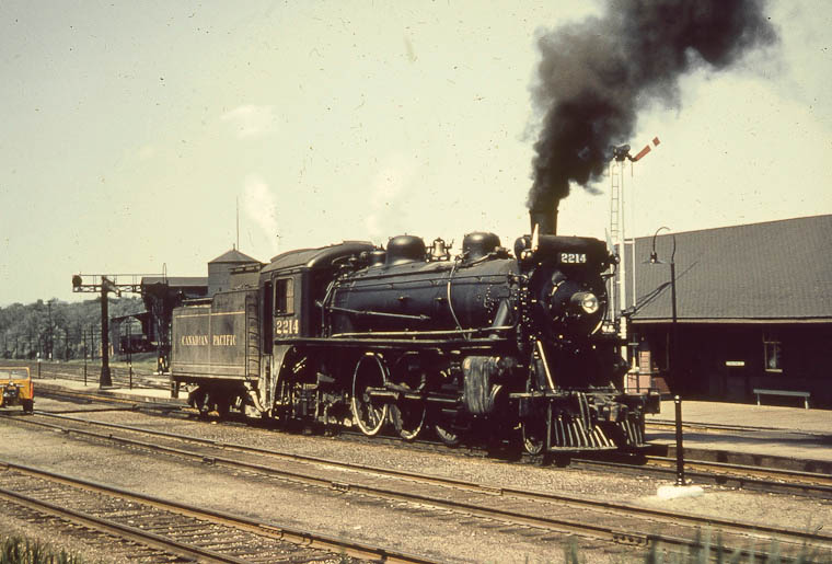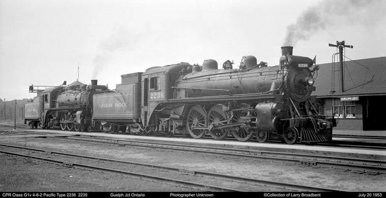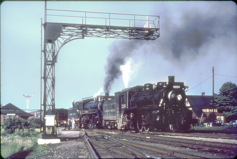 2214 assisting 5406 at the Junction. Engines have been cut off the train possibly to go for water since it looks like the fireman is on the back of the tender while a conference is being held by the rest of the crew! Paul Meyer/L.B.Chapman Collection