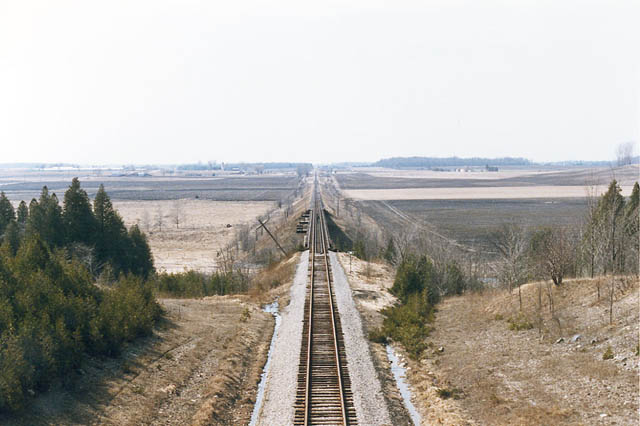 This view of the Goderich Sub. outside Elmira, looking west shows how straight the line was. April 1986. Eugene D. Burles
