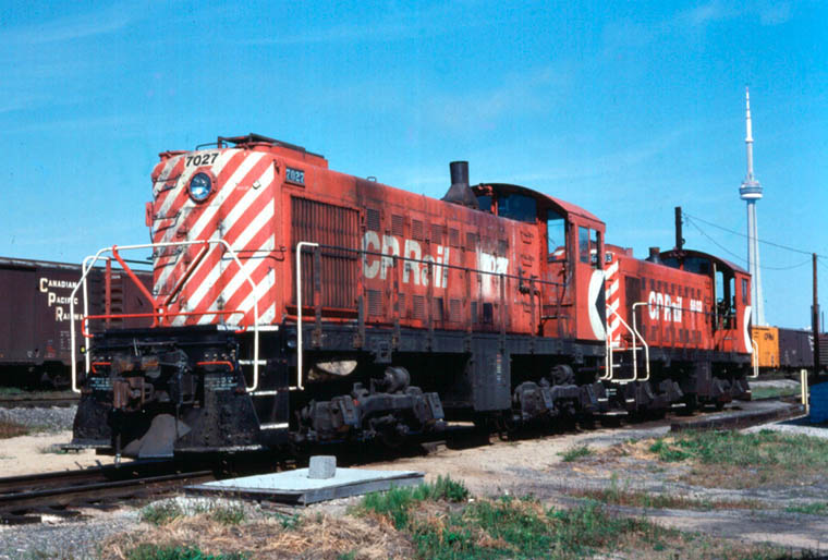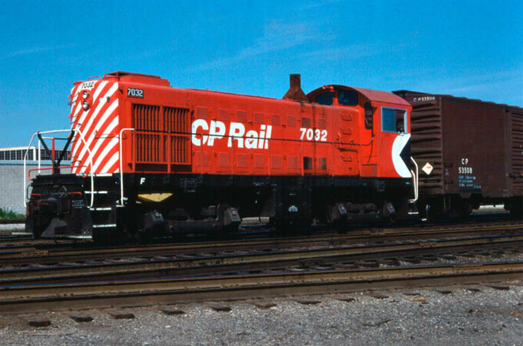 A filthy 7027 (Alco S-2 #77385 6/1945) sits with 6603 (MLW S-10 #82408 1/1958) on a siding east of the yard office at Parkdale. Note that 7027 still has original single headlight and original Blunt trucks. It would later get modified with roller bearings and newer style trucks from smaller horsepower units such as 6603 behind it which would also get roller bearings. Note too the combination pilot a Canadian invention. Compare this to the much cleaner 7032 below which has newer twin sealed beam headlight. It too got the newer style trucks but, would not get roller bearings. As the 660 hp units were retired their trucks went to 1000 hp units. Not all were done. This was because the Blunt truck was very labour intensive to do a wheel changeout. Both photos September 1978 Randy Kotuby