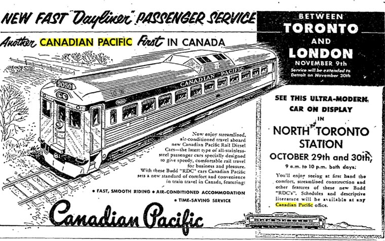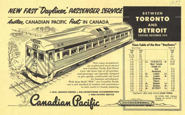 Named Dayliner by the CPR the name stuck for both public and employees who also called them "Budd Cars". Few knew them as RDC's. The newest thing in passenger travel, the Dayliner, a fast, good-looking stainless steel self-propelled car in which you could travel in air-conditioned comfort. These two cars went into Toronto-London service Monday, November 9, 1953 which was extended to Windsor and Detroit effective November 30th. The fast schedule took less time than the famous Jubilee