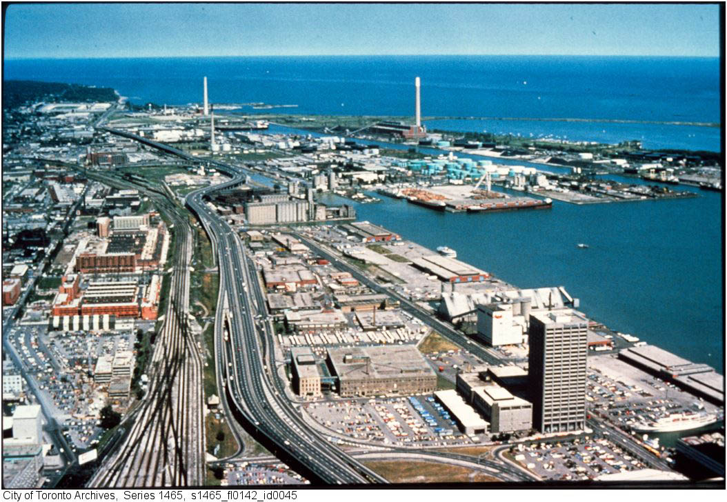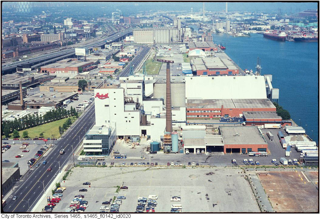 This view looking east gives a better perspective of the Redpath location and its surroundings. Refinery and storage shed to the right with Toronto Star (newspaper) headquarters office tower bottom right. Victory Mills elevator beyond in middle with Dominion Malting almost hidden behind. Ashbridge's Bay above with THC Piers for cargo ships. Tall stack in right background is long-closed (1983) Ontario Hydro Hearn Generating Station. Tracks at east end of Union Station at far left. Elevated Gardiner Expressway in middle.