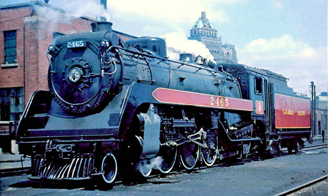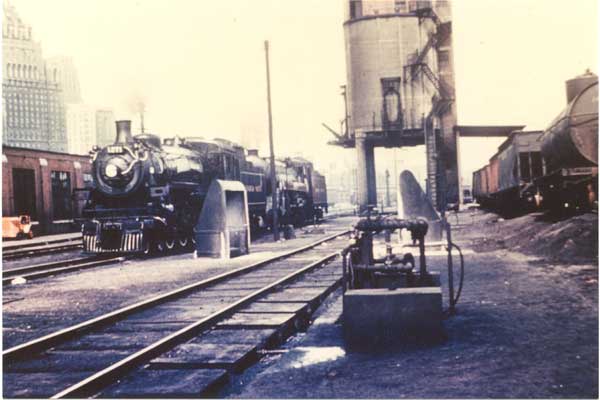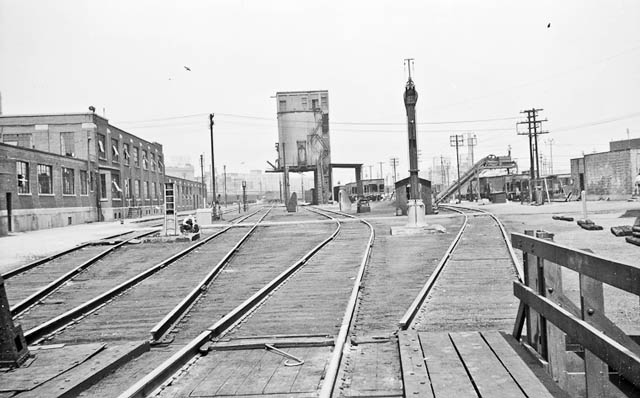 Detailed description of above scene The John Street Locomotive Department facilities were entirely replaced as part of the Viaduct project and included a 32 stall roundhouse with a 120 foot turntable, the largest size table on the CPR. It was the most modern roundhouse in Canada, featuring a direct steaming system to reduce smoke, and replaced the original 1897 roundhouse, (opened November 13, 1897 with machinery and 70' turntable from ex CVR Parkdale roundhouse) which had been expanded in 1919. (In 1911 an 80 foot turntable was installed and in 1918 an 85' one as larger locomotives came along.) Only the first 28 stalls could be opened in October 1929, then the old lower level roundhouse was demolished, following which the remainder was completed. A 350 ton mechanical coaling plant and a 60,000 gallon steel water tank were part of the engine facilities. A large building, (361 ft. long, 40 ft. wide at the west end and 30 ft wide at the east end), known as the stores building, contained not only the Stores Dept. but also ancillary shops for both the Locomotive Department and the Car Department as well as office space. A Car Forman's office was located at the east end and the Locomotive Forman's offices at the west end. In 1955 a single level extension was built on the west end with a stores truck platform, and offices which included the Booking In Room for engine crews. Diesels first came to John Street in the early 1950's, initially on the transcontinental trains, The Canadian and The Dominion, as well as Montreal-Windsor trains #21 and #22; gradually replacing all steam locomotives. Yard diesels began to work in the downtown area beginning with 7020 at King Street in October 1944, however these diesel units were maintained at the old West Toronto roundhouse. Modifications, (primarily steel catwalks etc.), including concrete block firewalls were later made inside John Street roundhouse to service diesels.