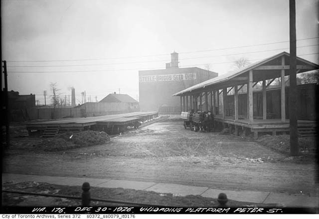 One team at the new team track. Race horses and automobiles were also handled here. Peter Street looking south west. Steele-Briggs Seed Co. building on Spadina had a private siding and shipped seeds all over for many decades. ![]()
