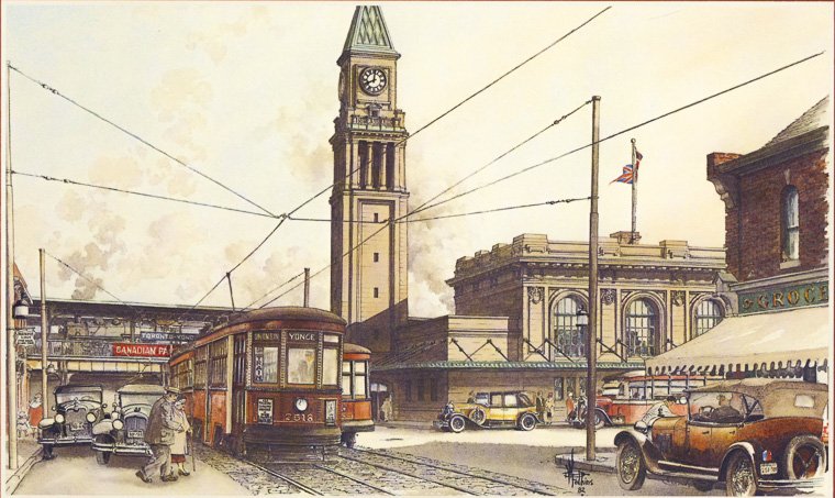 print by the late Wentworth D. Folkins. North Toronto Subdivision Mileage .0 Leaside to Mileage 5.9 West Toronto Diamond. Originally this line was the CPR’s entry into Toronto, constructed by the infamous Ontario & Quebec Railway it was completed August 31, 1884 from Perth via Havelock, Peterboro, Agincourt and Leaside through North Toronto to Toronto Junction in West Toronto and reversing down to Parkdale and Toronto. The line had already been opened in sections with passenger service between Toronto via Parkdale and Peterboro commencing June 28th. and opened to Norwood July 30th. The O&Q had already been leased by the CPR on January 4th for 999 years! In the 1980’s this would come back to haunt the CPR when minority shareholders would challenge the lack of reimbursement for assets sold. All the land the CPR used in Toronto legally belonged to the O&Q; this included all the prime downtown real estate, much of it sold off by the CPR. Places such as the King Street Shed on which now stands Roy Thomson (concert) Hall, and the Metro Hall office building. It would go on for years in the courts before it was finally settled and affected many decisions the CPR made. In the end the shareholders lost out. Eventually, it and O&Q leased Toronto, Grey & Bruce were both absorbed into the CPR Prior to the huge Viaduct project along the Toronto waterfront the North Toronto Grade Separation project took place from 1912 to 1917. It involved ten subways, or underpasses as they were later called, to eliminate level crossings of streets along the North Toronto Subdivision between West Toronto and North Toronto. This very busy four-track line carried all freight trains in and out of Toronto as well as serving local industries, which once were plentiful. Actually, the two middle tracks were the main lines with a north and south service track to gain access to industries and team tracks on both sides of the right-of-way. Note: A second track was first built in 1905 between North Toronto and (West) Toronto Junction. Double track Leaside to North Toronto 1918 article. In addition to the grade separation and double tracking (Completed July 4, 1918 between North Toronto and Leaside), there were other key features involved in North Toronto and Leaside. Canadian Northern, Canada’s third transcontinental railway, was also expanding. The CNoR entered Toronto from the north (Muskoka Sub. from Capreol) built 1906-07 via what is now the CNR’s Bala Sub. to Rosedale in the Don Valley (near Bloor Street) where a small yard and rectangular engine house was located. Its east mainline from Ottawa (Orono Sub.) built 1911-13, passed through Scarborough just north of the GTR Danforth yard, to meet with the northern line at Todmorden, just south of Leaside and about 2 miles from Rosedale and nearly 4 miles from Union station. The CNoR had difficulty getting access to the downtown area being the last railway to enter Toronto, but did eventually manage to secure an agreement to get there over the GTR via the old Toronto Belt Line from Rosedale. The CNoR needed bigger facilities for Toronto so it built new shops (opened 1919) at Leaside including an erecting shop for locomotives, a coach shop and a (freight) car shop. A small yard was also built. In order to get access to this property it had to build a connection from the Bala line south to Leaside. The line up the Don through Rosedale climbs a grade, crossing well below the CPR before reaching higher land near Oriole. Here a connection was built for southward to westward (or east to north) movements to Donlands (2.2 miles) where it connected with the CPR to reach Leaside another 1.3 miles and completed in June 1917 although it did not go into operation until February 1, 1918 likely held up reaching agreement on terms and conditions. It was intended to connect the Ottawa mainline from near Scarboro Village via a four mile long new connection to Donlands and then to Leaside. It needed at 650 foot long viaduct to cross the Don Valley. Disputes over level crossings delayed work and it all ended with the failure of the Canadian Northern and its take over by the Federal Government. It was not long before most of the mainline between Toronto and Ottawa was abandoned beginning in 1923, there simply wasn’t a need for four main lines. Toronto, Niagara & Western was yet another railway that sought entry into Toronto via North Toronto. It was controlled by MacKenzie and Mann of Canadian Northern fame. This was a proposed electric interurban railway sharing the Hydro right-of-way from Niagara Falls to Toronto. Entry into Toronto would have been across the Humber River at Lambton parallel to and north of the old Toronto Belt Line to West Toronto (Keele Street just north of St.Clair Avenue West), where it would have dropped into a cut to underpass both the GTR’s Stratford line and the CPR’s Sudbury line (Mac Tier Sub.) as well as some streets. Just south of St.Clair Avenue it would have entered a 2360 foot long tunnel under the GTR’s ex Ontario Simcoe & Huron Railway (Ontario’s first railway) at Davenport and exit at Davenport Road and St.Clarens Avenue. The hydro right of way ended here at the Bridgman transformer station. The radial railway would then run parallel to and north of the CPR North Toronto Subdivision over to North Toronto (Yonge Street). Joint Section agreement was reached October 1, 1915 permitting the CNoR use of CPR’s North Toronto station along with joint tracks and common tracks. Nothing ever came of either the TN&W being built nor CNoR trains entering North Toronto due to the financial failure of Canadian Northern. The CNR did operate over the Oriole spur to Donlands and over CPR into Leaside to reach local industries there as well as the railway shops. It also had use of common tracks from Leaside to North Toronto and over the north service track along with exclusive rights to traffic from local industries on the north side between Avenue Road and Doverc