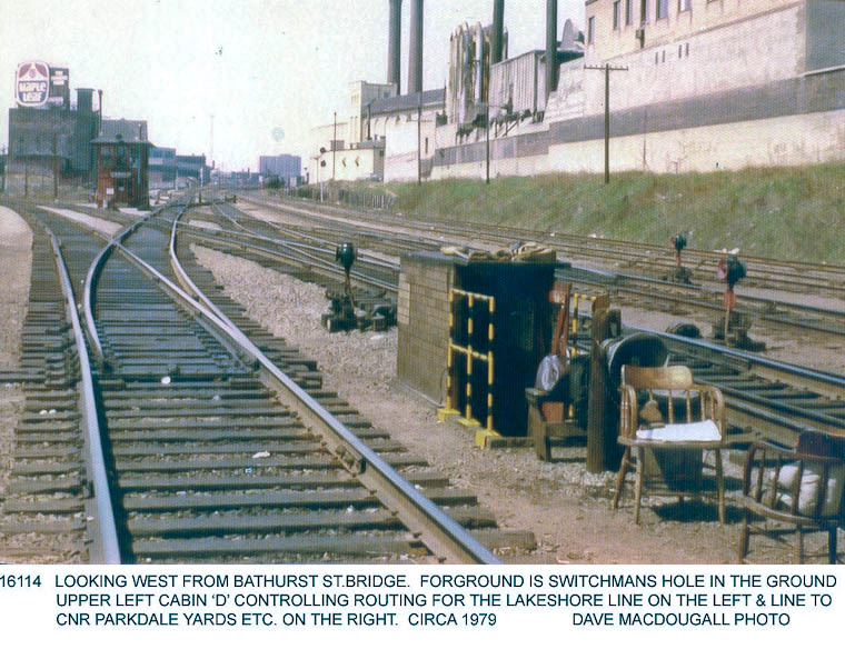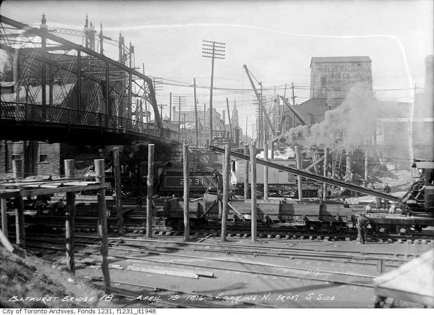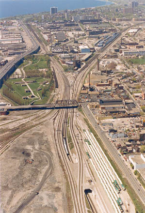 At left is King Street Shed lead (Front Street West at far left). Spadina Avenue bridge in background.