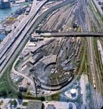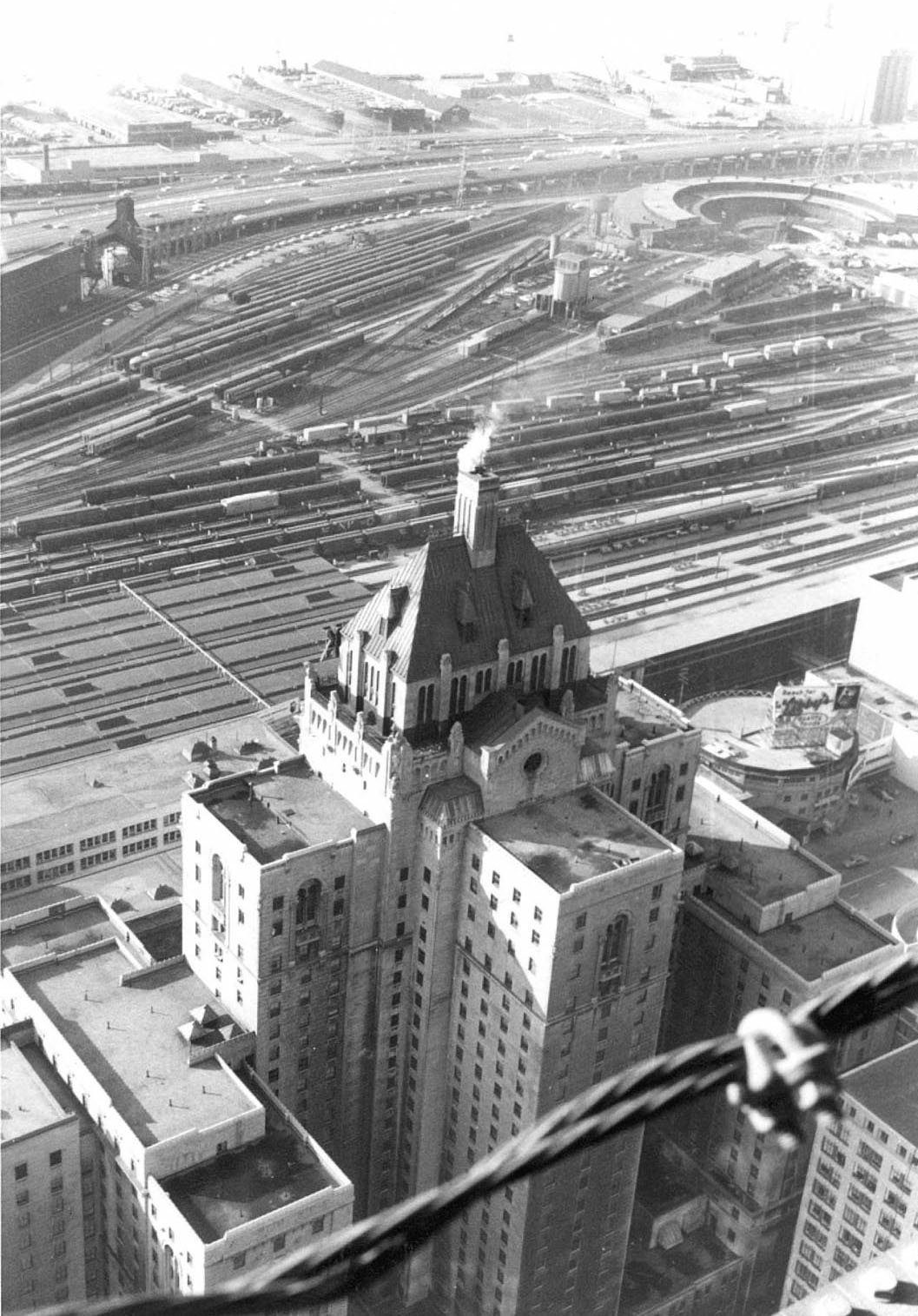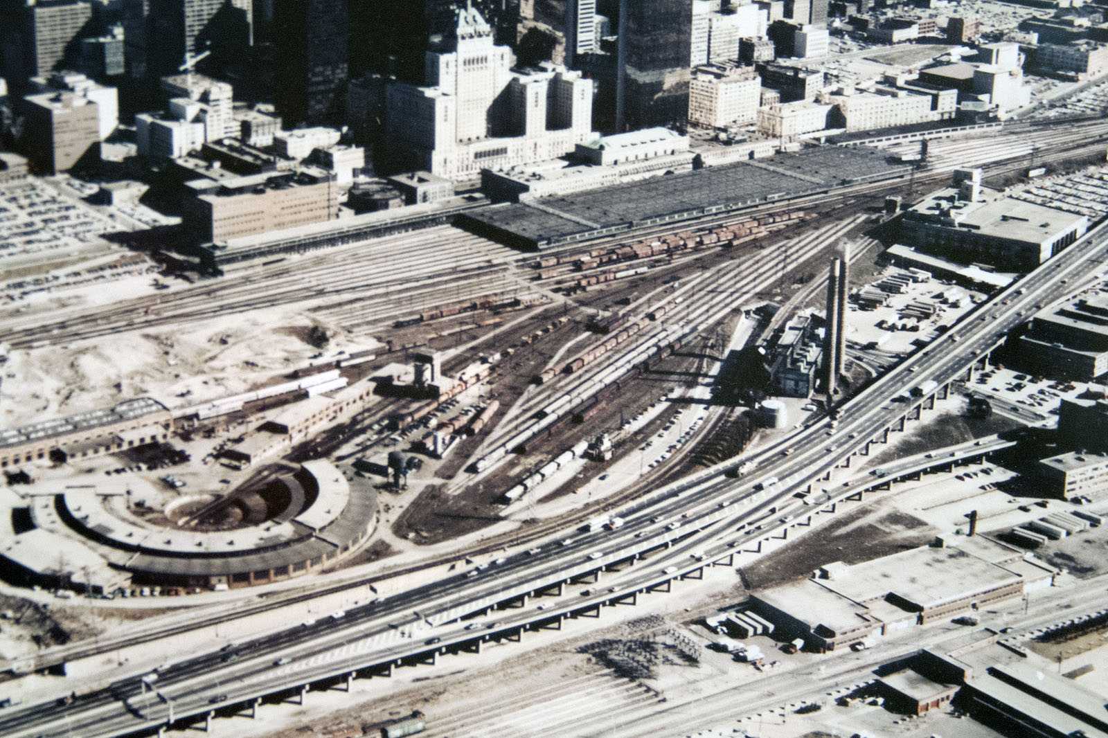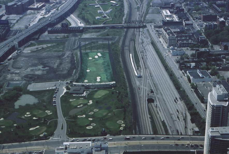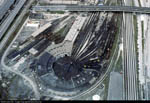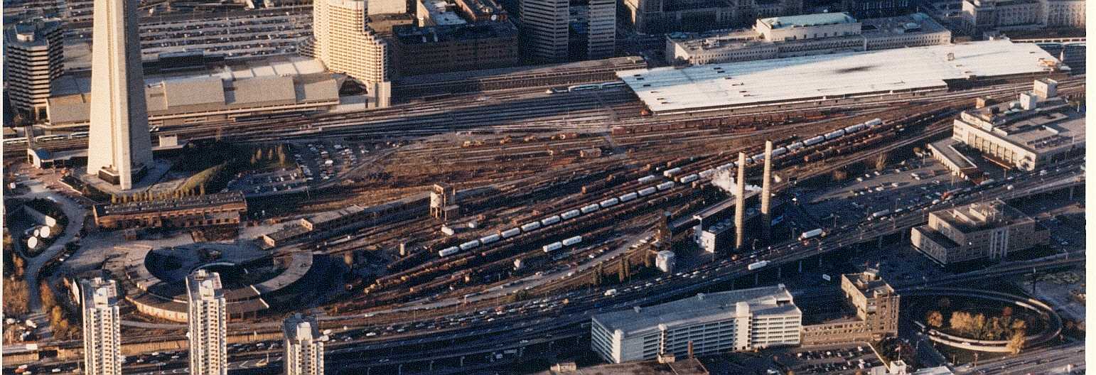 and Coach Yard, also Union Station. Aerial c. 1973 This view from the CN Tower looking west towards Bathurst Street bridge, former Cabin D area, with Parkdale IMS yard in the distance. Foreground shows construction underway on site of former CNR Spadina Coach Yard, Flyunder with train exiting, GO Bathurst North yard at right. May 1987 Eugene D. Burles
