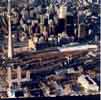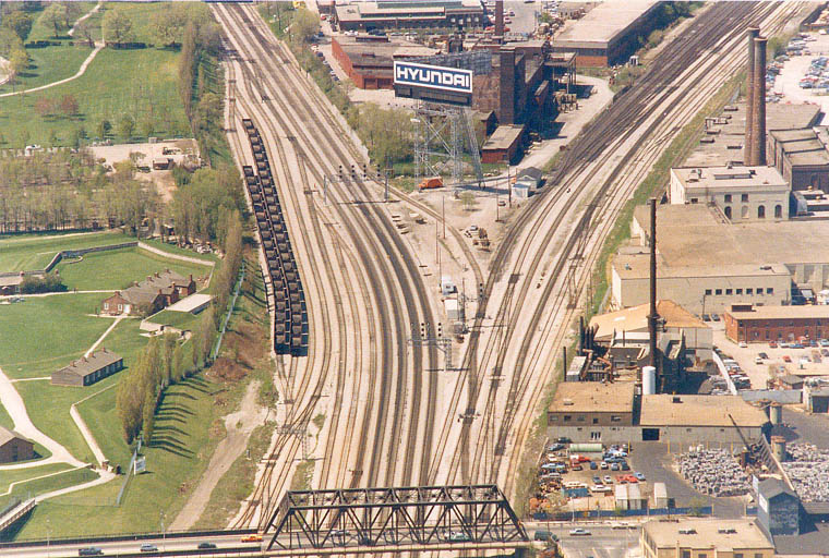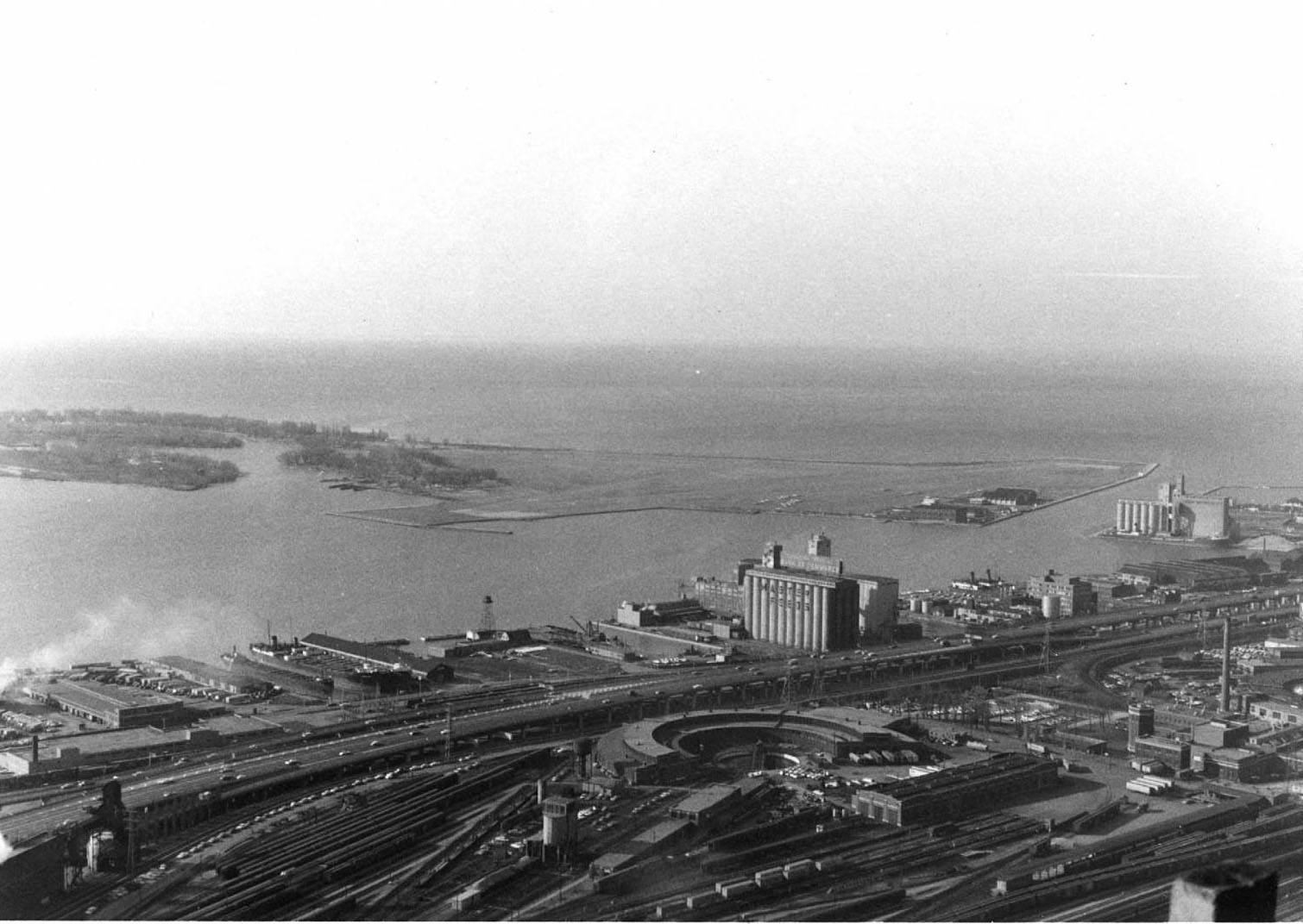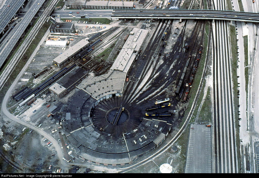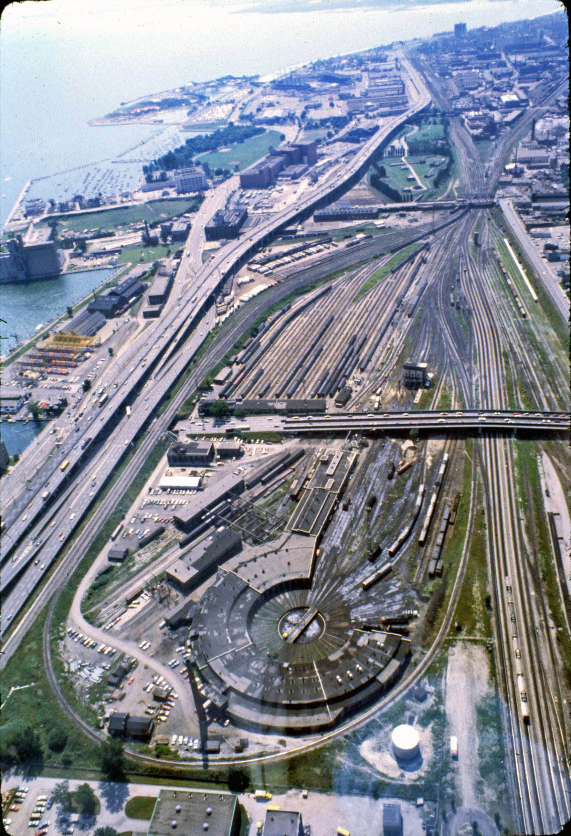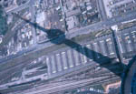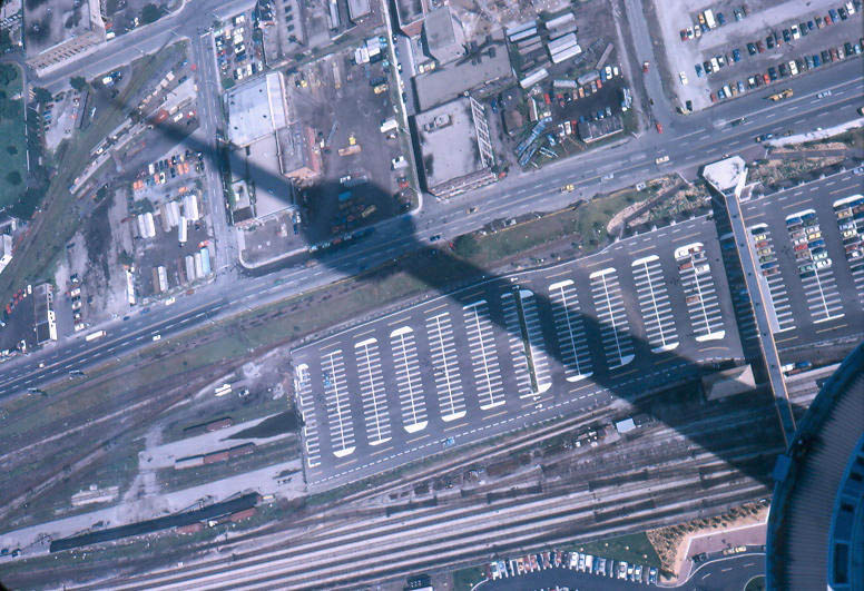 and Coach Yard, also Union Station. Aerial c. 1973 This view from the CN Tower looking west towards Bathurst Street bridge, former Cabin D area, with Parkdale IMS yard in the distance. Foreground shows construction underway on site of former CNR Spadina Coach Yard, Flyunder with train exiting, GO Bathurst North yard at right. May 1987 Eugene D. Burles