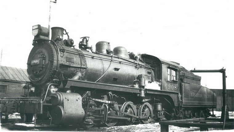 6908 taking water on shop track. 1940 CPR 9/1913 . Al Paterson/Bud Laws Collection V4a Cylinders 22 1/2" x 28" drivers 52" press. 180 lbs. 41,700 t.e. 6 tons coal and 5,000 gallons water.