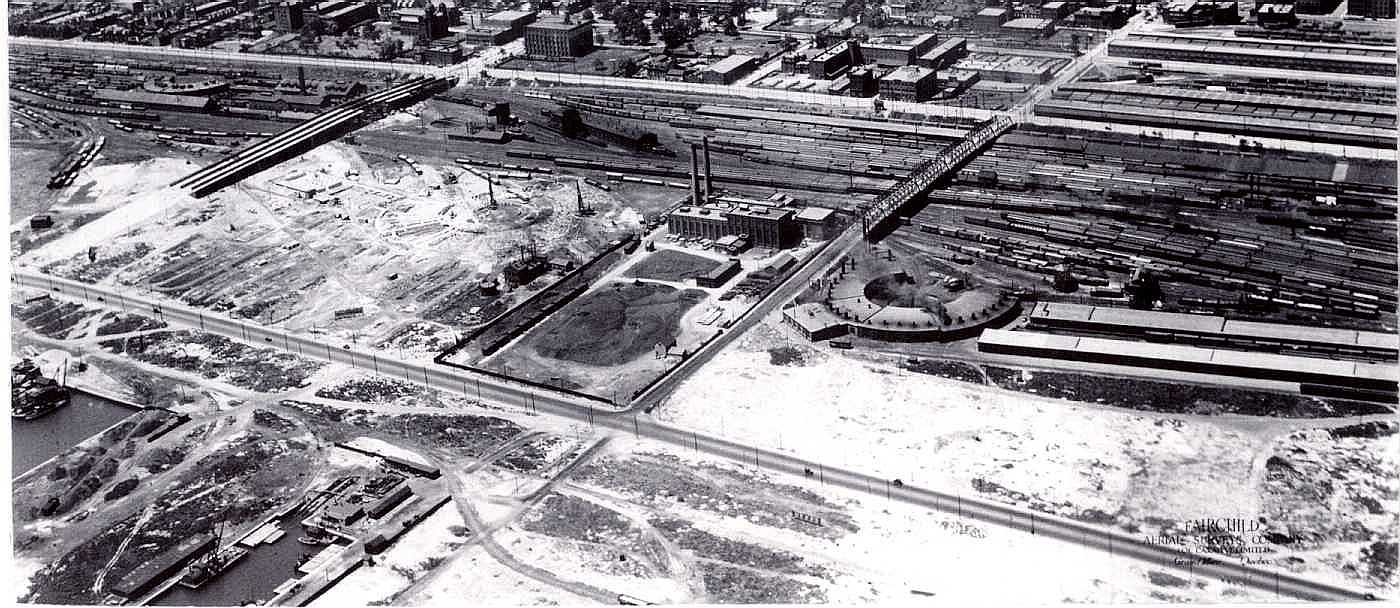 View looking northwest. Old John Street roundhouse and Freight Sheds, bridge, pumping station (city water). CNR Spadina roundhouse and bridge, both under construction. Old GTR engine shed. Separate turntable to left. Old GTR roundhouse far left. Fairchild Aerial Surveys/Archives of Ontario.