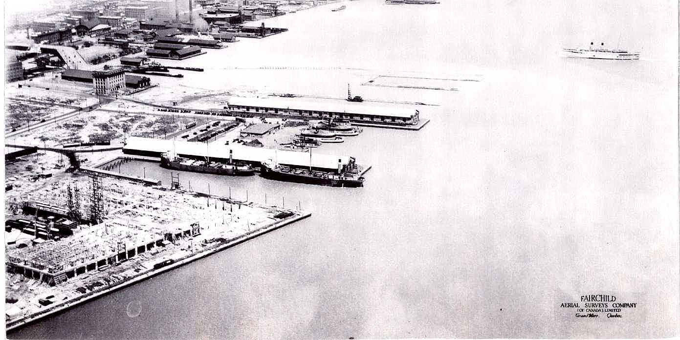 Similar view looking east. Terminal Warehouse under construction. Toronto Harbour Commissioners office building. Fairchild Aerial Surveys/Archives of Ontario