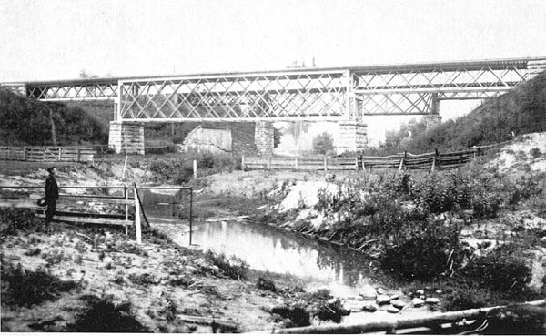 ![]() Old Black Creek bridge, looking west at mile 6.2 of the original TG&B line to Bolton and Orangeville. Presently, this is Mile 1.57 of the MacTier Subdivision, located at Weston Road and Black Creek Blvd. Canadian Pacific A12231 Back (Use your browser Back button)