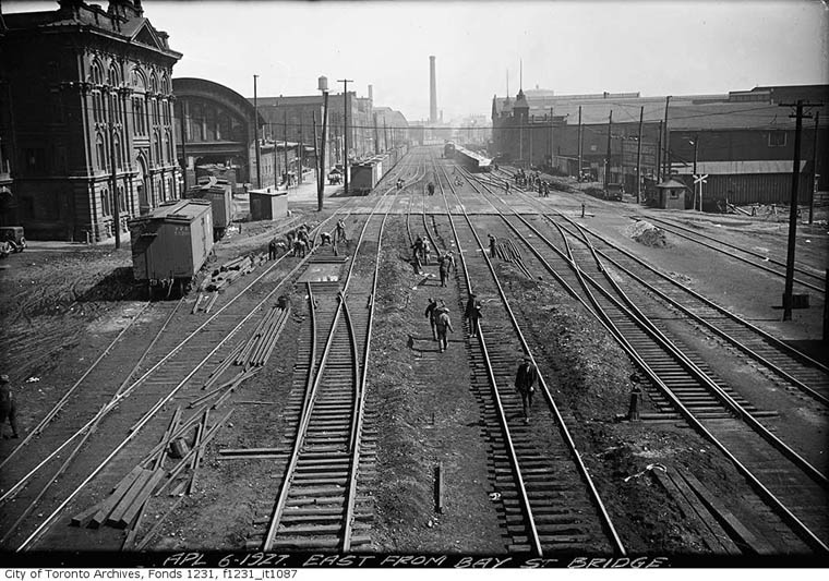 Esplanade undergoing extensive track relocation for the new Union Station opening in two months and before the High Level was created. Note the old Great Western Station (curved roof) at left in use as the Toronto Wholesale Fruit Market.