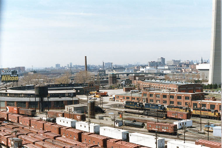 This view of John Street looking northeast was taken in its last year, 1986. It is spring and the work gang equipment that has wintered here is still waiting assignment. Converted box cars and newer white modular units on flatcars fill the South yard. |