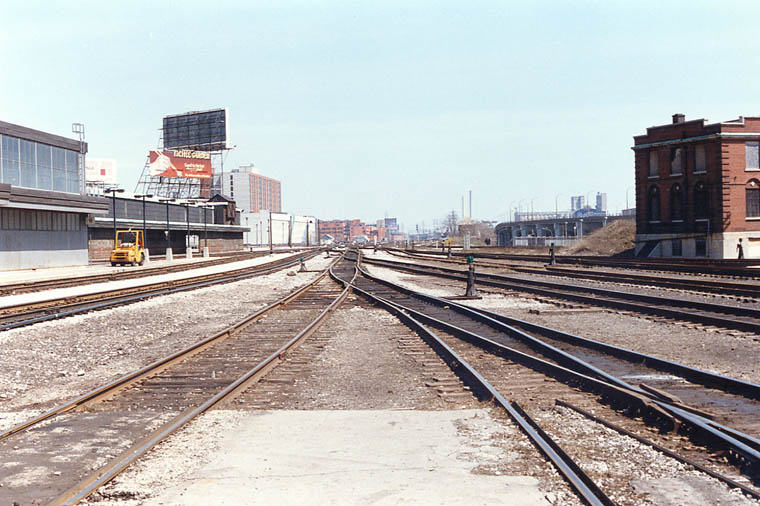 Looking east from the Midway, Coach Yard Office at right. Union Station train shed at left.