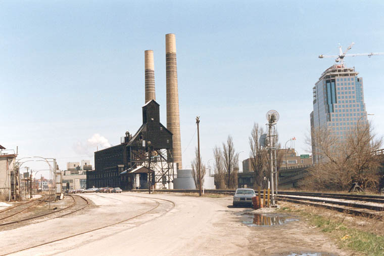 Looking east along the roadway and loop. Wash rack at left. CNR High Line at right. TTR Central Heating Plant in center. Note: Employees could park here if they displayed a parking permit on their car. |
