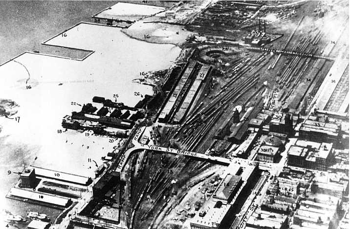 Old aerial view taken prior to Railway Viaduct project. Numbers include: 14 new union station, still not in use; 23 old union station; 27 CPR freight sheds; 28 old CPR John Street roundhouse. |