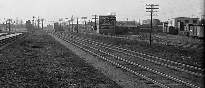 Penfound Varnish, Osler Street team tracks and other small industries off the Old Bruce service track. Old Bruce Service Track later known as S Yard, and finally PS Lead, ran between West Toronto Diamond and Dundas Street West just north of Parkdale, and was once the Toronto, Grey and Bruce mainline. It was east of the Galt Sub. and was separated by the CNR Weston Sub. double track. It remained in use for many years to serve a number of