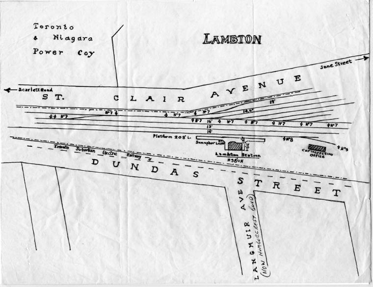 Dundas Street is on the right (note second row of poles). Located near former Diamond with Old Belt Line. When removed, it is believed part of the structure became Keele Street Yard Office. June 1911 J.W.Heckman/Canadian Pacific Corporate Archives. Collection of R.L.Kennedy |