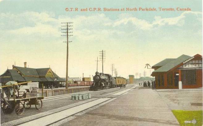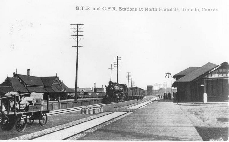 Here it is re-named just Parkdale following closing of South Parkdale station on the GTR. However, the GTR station at left is still lettered North Parkdale. Westbound passenger train is just arriving, looks like a G1 Pacific. Note the milk cans and wooden platform. Could be coal chutes in background of eastward main track. Al Paterson Collection