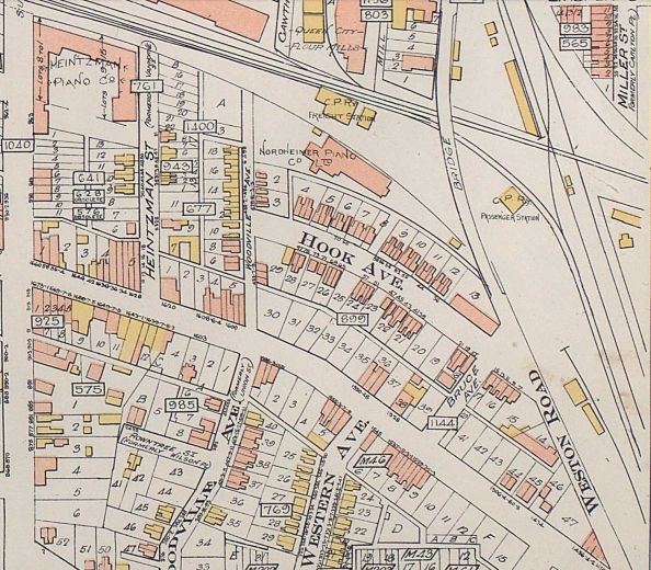 First station, built in 1885. Two story building nestled between Nordheimer