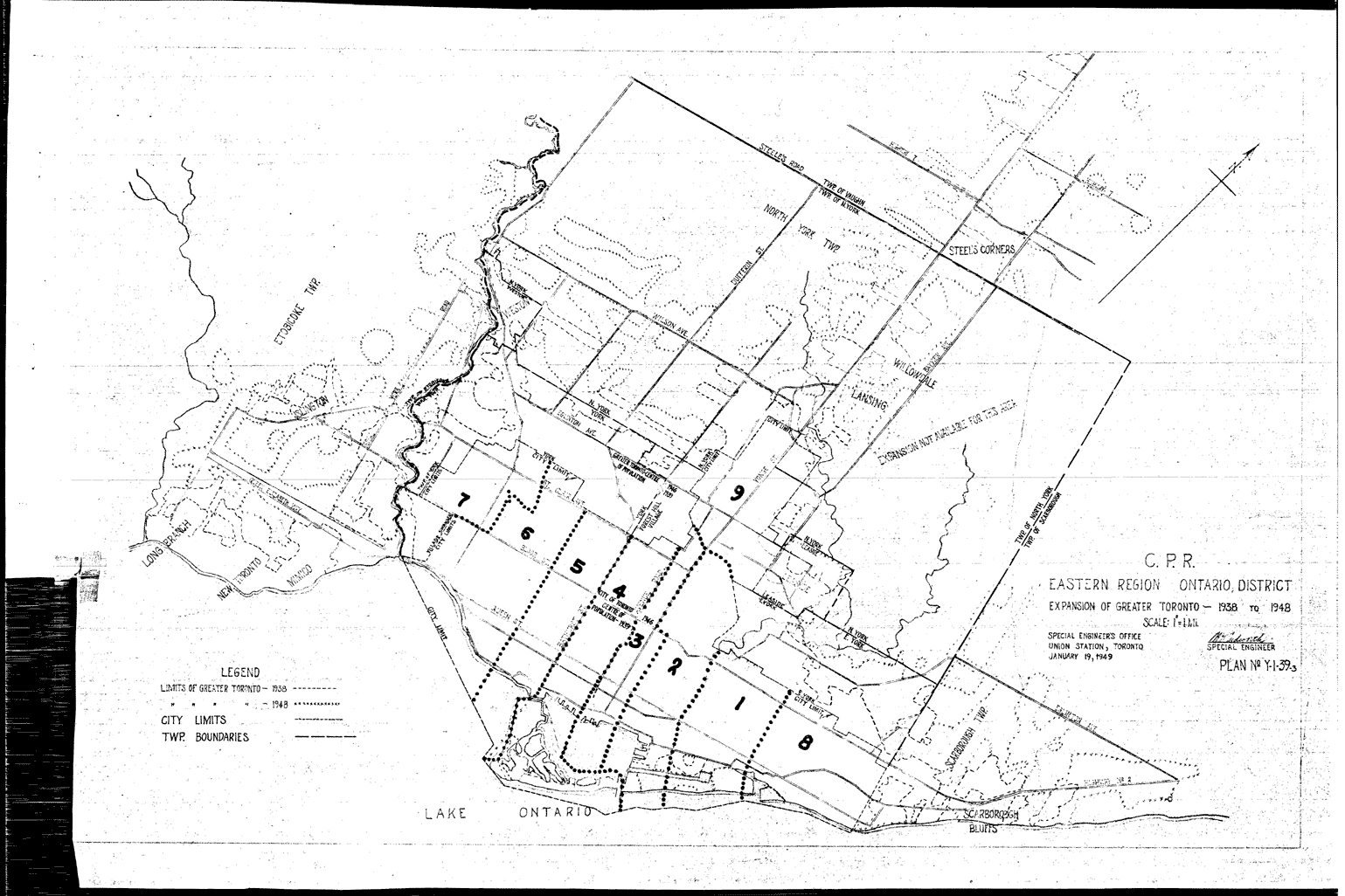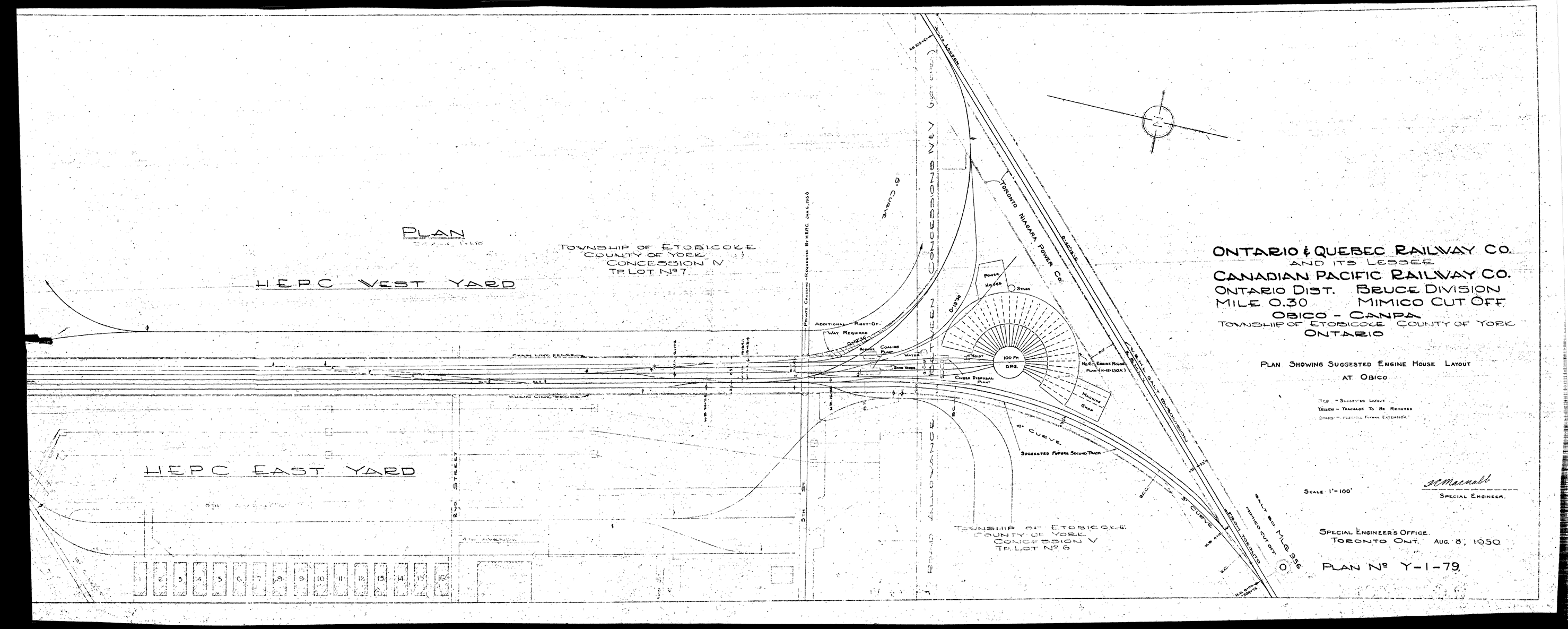 PROPOSED CPR WEST TORONTO-LAMBTON HUMP YARD by R.L.Kennedy In 1950 the CPR proposed to expand Lambton and West Toronto Yards, and in one version a hump yard would have resulted. This followed the previous year's study to build a new yard at either Kleinburg, not far from where Vaughan Intermodal Terminal was eventually built, or at Wexford just slightly west of where Toronto (Hump) Yard was built (opened April 1964) in Agincourt. The new yards both featured a bypass north of the City, and Kleinburg included another bypass connecting to the west of Toronto like the CNR's 1967 bypass. Proposed CPR Belt Lines to ByPass Toronto 1949. Scheme Type add. land ...Increase Car Capacity Est. Cost 1: ..........flat.. 10.45 acres 634 cars....... 29.7% ..$3,219,000 2............flat .. 9.85 acres. 611 cars....... 28.6% ..$3,343,000 3........... flat... 9.85 acres. 815 cars ...... 38.2% ..$3,307,000 4 ......... hump 25.80 acres 588 cars ...... 27.5% ..$5,074,000 All schemes included a $275,000 central steaming plant as a means of smoke abatement such as was being employed at John Street and St.Luc. Scheme 1 included about fifteen 100 car tracks in West Toronto yard, but a decrease in capacity in Lambton yard. The yard office would have been relocated to the south side of the mainline on the east side of Runnymede Road at Maria Street in a coal yard. The Here yard would be relocated to the east side of Runnymede at Ryding Avenue. Other relocations were required and a widing of Runnymede subway, also acquisition of two small industrial properties and 8 houses. Scheme 2 required a massive rebuilding of Lambton yard with lead tracks running at an opposite angle with the main line with capacities starting at 125 cars and decreasing to 6 cars. The yard office would be relocated to near Gourlay Crescent and the abbattoir lead. Acquisition of one small industry and 8 houses was required. It would have been very disruptive during reconstruction. Scheme 3 provided 100 car capacity tracks with the yard office also relocated to near Gourlay Crescent. It too would have required acquisition of one small industry and 8 houses. Relocation of the coaling plant to the north side of the shop tracks of Lambton roundhouse was involved. Scheme 4 created a hump yard on the West Toronto side with the hump crest at Runnymede Road just as was the exisiting hump. Cars would be humped to the east with a long hump lead stretching west to the Humber River. Lambton yard, unchanged (tracks #1-20 90-16 cars; 1161 total), would handle all arrivals and departures. It would require a 1,682 foot retaining wall running eastward from Runnymede Rd. near the main line and a 470 foot wall by Lambton Roundhouse. Extention of Runnymede subway and a small extention of Jane Street subway would be required also a shop lead hump underpass track. It would require acquisition of four industries and 32 houses at a cost of over a half million dollars and would consume all of Ryding Avenue park, all houses and the street itself with the property line along the south side of a laneway between Ryding and St.Clair Ave. Relocation of the coaling plant and sand house was also required. Power switches and retarders would add another $850,000. This plan made the most sense in getting a more up to date facility. The classification yard featured 40 tracks with a total standing capacity of 1231 cars as follows: 7 tracks 12-19 cars; 12 tracks 20-29 cars; 13 tracks 30-39 cars; 6 tracks 40-49 cars; 2 tracks 52 & 55 cars. Lambton #23 and 24 would continue to be used for inbound and outbound trains with the option of crossing over to/from the main lines at Runnymede. #24 was a lead for use by the Big Lead engine. Next to 23 is West Toronto 18 which would remain and could be used by a puller engine taking train to departure track in Lambton yard. Lambton would remain unchanged with tracks #1 to 20 holding 90 to 16 cars. The Here Yard would be greatly reduced from 13 tracks to 6 shortened tracks holding only 41 cars and Storage Yard 4 tracks eliminated, grand total 152 cars. A new Yard for storage would be built along Ryding Avenue with dead-end tracks at the east sidewalk of Runnymede, with 7 tracks holding 222 cars. A small 4 track yard next to West Toronto Scales would hold 67 cars. The Grand Total of 2722 cars was a 27.5% increase of 588 cars. COSTS: New 100lb. rail $86.00 per ton. New #2 ties $2.40 each. Complete track: $9.75 per foot. Relay 100lb. rail $22.00 per ton. Scrap rail $10.00 ton. TRAFFIC HANDLED During July 1947 Lambton Yard received 1,531 trains handling a total of 53,033 cars. Lambton Hump Yard This is an old 1950 blueprint. Due to the lack of colour in the scan, the red and yellow lines showing changes are not detectable. If you compare it to another plan of the yard you may be able to discern the changes. Concentrate on the area around Runnymede Rd. and the roundhouse, look for traditional hump layout there and to the west. NEW ROUNDHOUSE AT OBICO Obico Locomotive Terminal another old 1950 blueprint. All of the proposals to expand Lambton and West Toronto Yards involved removal of the newest part of Lambton roundhouse, (at least 10 pits), to compensate and to allow for increased traffic an entirely new engine terminal was planned for the wye area of Obico officially M. 0.30 Mimico Cut Off on the site of an OCS coal dump. Lambton likely would still handle yard, way freight and assist engines, all using small power. Diesels might have been transfered from West Toronto roundhouse to close it. It featured a 29 stall roundhouse with a 100' turntable. Two tracks ran into a built-on machine shop. There was also an attached power house. The four shop tracks had a coaling plant, sand house and cinder plant as well. By comparison Lambton had a 37 stall roundhouse with a 90' table. John Street was 32 stalls with a 120' turntable. The old roundhouse at West Toronto with its 70' table was still in existance but used only minimally, it did however contain a diesel