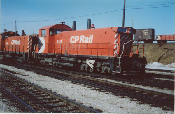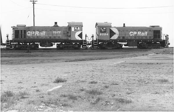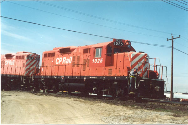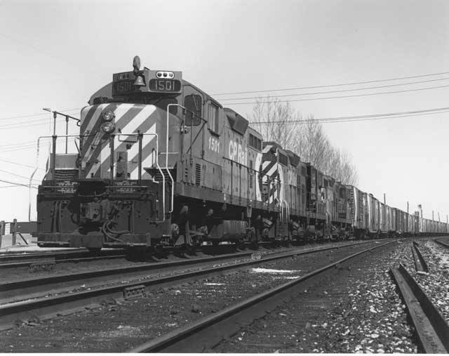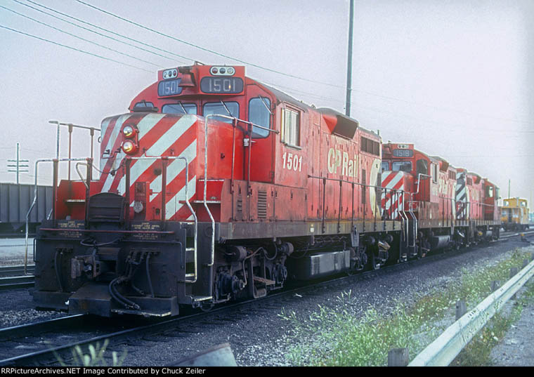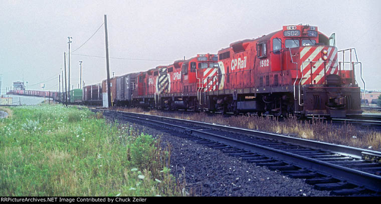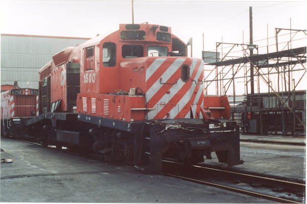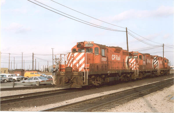 6594 and 7077 at North Bay, May 21, 1983 In 1980 a system-wide program of remanufacturing road switchers into yard switchers was begun utilizing a surplus of medium horsepower old GMD GP7 and GP9 road switchers no longer adequate for the heavier freight trains being operated across the system. This was done to deal with the need for more powerful yard switchers to handle increased train lengths and weights at yards. 660 and 800 horsepower units just didn't cut it any longer and with the pending retirement of all Alco and MLW yard units (some of them approaching forty years old) that made up the majority of yard engines, something had to be done. They were to be remanufactured in-house at Ogden and Angus Main Shops. The first three units GP7's 1500, 1501 and GP9 1516, were outshopped at Ogden in December 1980 and sent to Toronto Yard to be used in a three unit set. Four more units (1517, 1518, 1519 and 1502) followed in January, February, March and March 1981 to provide a second set plus a spare unit. Later, in February and March 1982 two more rebuilt units 1534 and 1537, were added. 1500, 1501 and 1502 were lead units. This finally resulted in three sets of three units with two sets in hump service and a third as spare to allow for maintenance. Likewise there were now three sets of two 7400's for the Pulldown, one set being spare.