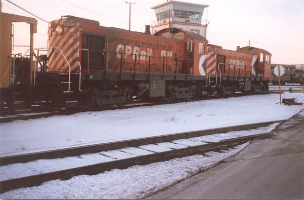 lbs. In April 1976 another pair of modified S3's 6576 and 6594 arrived for the Pulldown giving three sets of units. Also ballasted and M.U. 'able these units stayed to themselves. It was not until later on the units were actually mixed with each other. NOTE: All of the Alco and MLW yard units for all yards in Toronto were maintained at John Street roundhouse which was exclusively Alco to the end in 1986. All GMD yard units for Toronto and elsewhere were maintained at Toronto Yard. At one time the Pulldown jobs were assigned pairs of MLW RS-23 units.