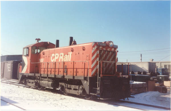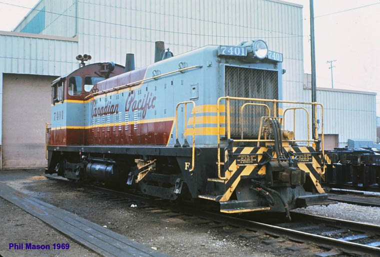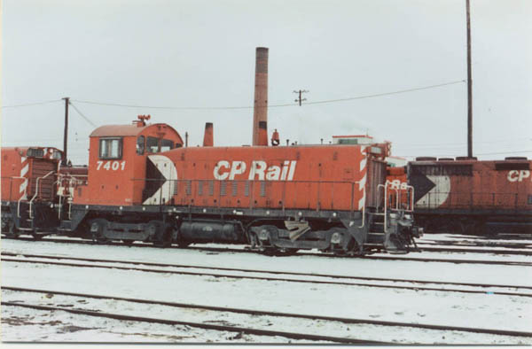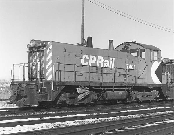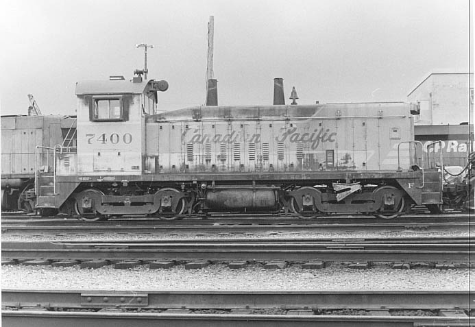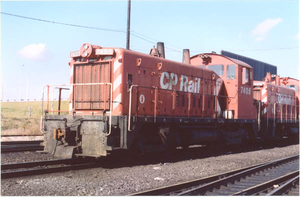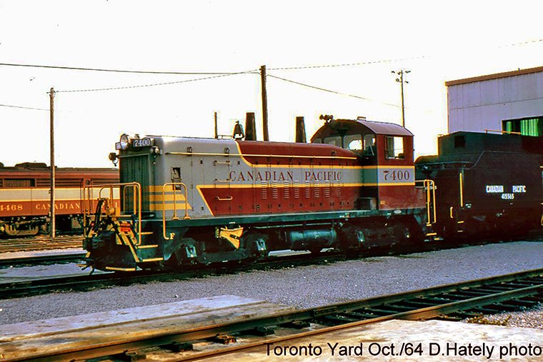 There were six GMD SW9 1200 HP switchers (A489-A494 1-3/1953) based on Western Lines since new and working various jobs out of Calgary and Vancouver as well as Field and Revelstoke yard. At 124 tons and 1200 HP there were the biggest yard diesels on the CPR at the time. Re-assigned to Eastern Lines and modified (1-4/1964) at John Street roundhouse for hump service. Units 7400, 7401 and 7402 (later 7403) were equipped with cab signals, slow speed hump control and non-standard M.U. on the rear only. This would permit three sets of two units each, two of which would work the hump each shift. While waiting for the hump yard to open the 7400's were used on various yard jobs including the Piggyback Transfer where their gearing and truck design allowed them to operate at high speed as they raced from the Queensway Pig Yard to Parkdale Yard to make tight connections with North West symbol trains. It wasn't long before it was found that two units were not always sufficient to handle the long and heavy hump moves. Four units were equipped with M.U. wiring on the front, permitting use of three units together. 7404 and 7405 remained as trail-only with no M.U. on the front. It was at this time that the units were marshalled in tandem (elephant style) with the engineer positioned in the rear most cab to permit better visibility.