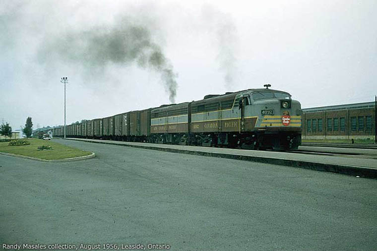 Second class freight eastbound at Leaside in August 1956, hauled by a pair of MLW covered wagons led by 4092, isn't stopping for an assist. Diesels were rated at 1900 tons each up Wexford and 2900 tons beyond. Station is behind photographer.