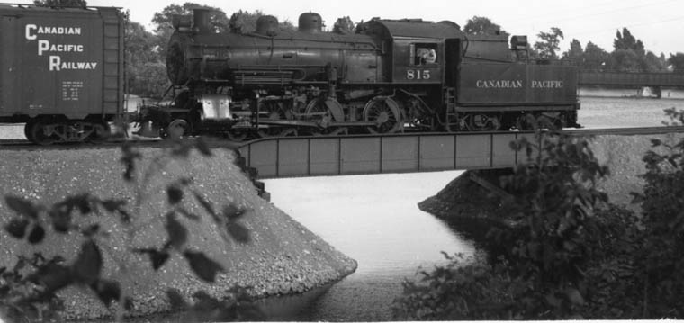 Peterboro yard engine 815 switching Quaker Oats. Main line bridge in the background. July 1954 Collection of William Flatt