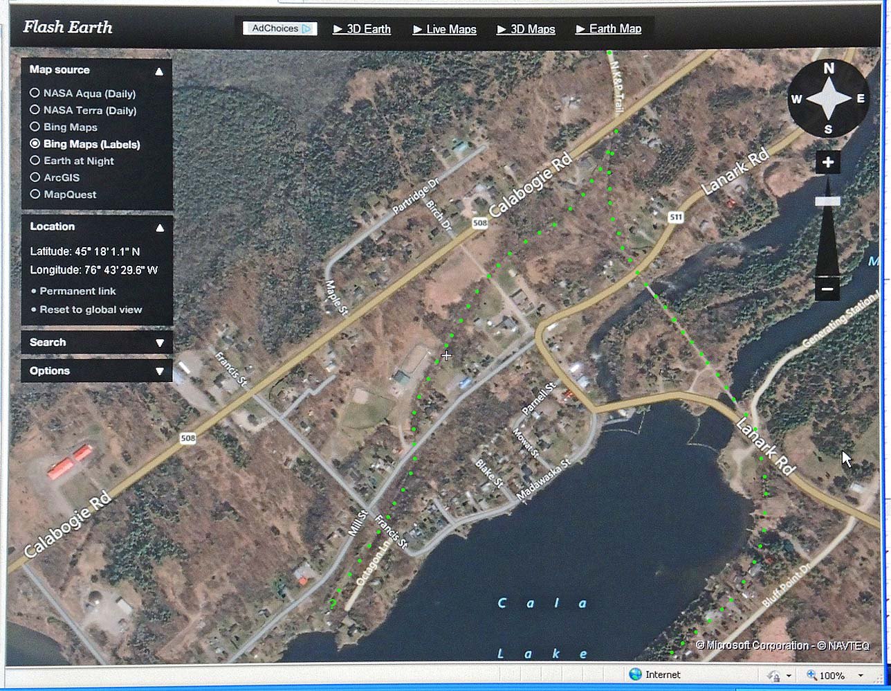 When our short mixed train had finished at Calabogie station (Mileage 14.4 due 3:15 p.m.) ) it moved north a short distance and stopped around a curve just out of sight. The mill spur was there and the loco cut off and with some box cars disappeared for quite a while. The above photo shows it returning to the train. To-days satellite photos show the spur going a long way southwest near to-days Mill Street, almost to the lake. It looks like the sort of place where logs were pulled up out of the water and fed into the mill. The buildings in the photo might have been for lumber but we did not examine them to know their true purpose. Satellite view