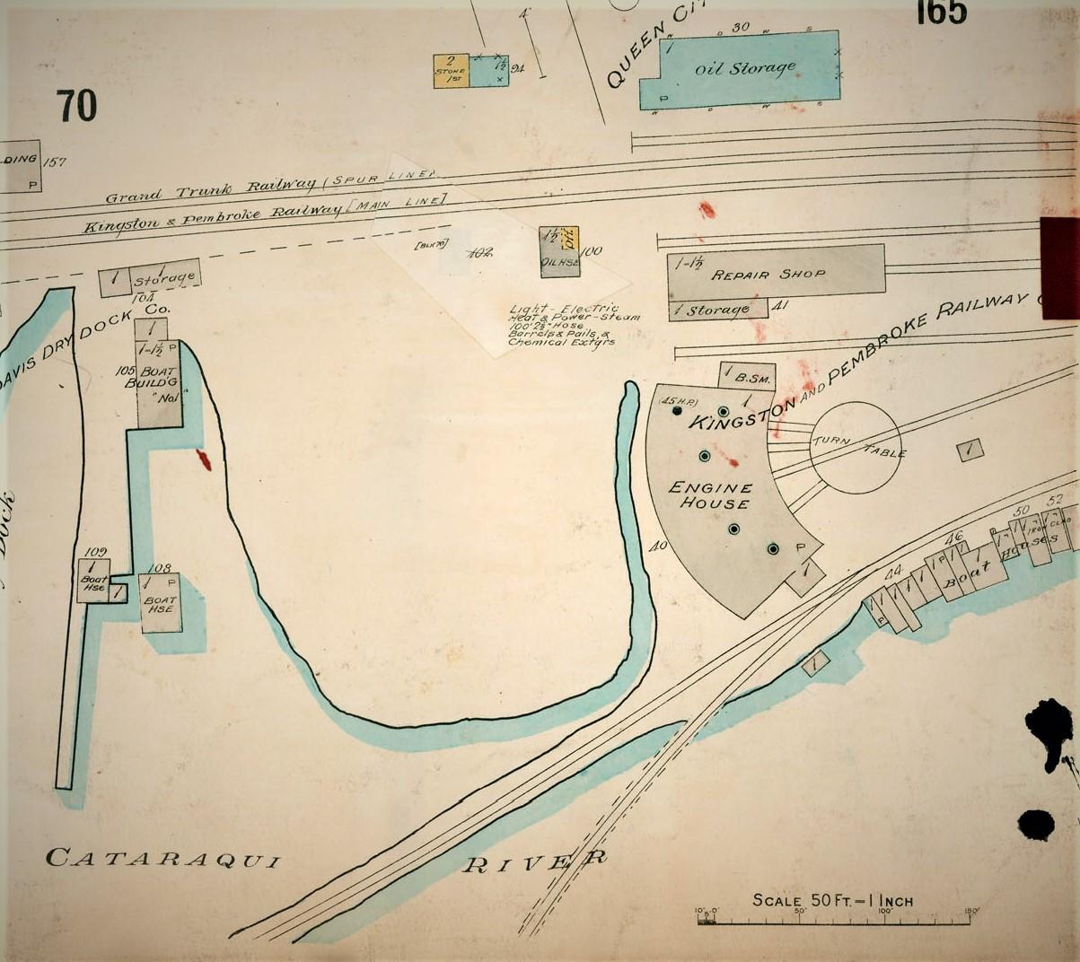 The Kingston & Pembroke was one of the few railways comprising the CPR's lines in southern Ontario and the Maritimes that actually operated independently for a few years. Most were "paper" railways, incorporated by the CPR itself, or fronted by people friendly to the CPR, or in fact to any major railway that would immediately buy them out to eliminate competition, or having them fall into the hands of another system. No less than six attempts dating from 1846 were made to build a railway from Kingston in different directions, none of which ever did anything. Finally, the Kingston & Pembroke was incorporated by local marine shipping interests April 14,1871 to build from Kingston to Pembroke and with a ferry or bridge across the Ottawa River to Quebec. The traffic sought was largely lumber from the headwaters of the Madawaska, Mississippi and Napanee rivers. The Railway Aid Act of 1870 helped get things going on June 17,1872 with a sod turning ceremony in Kingston. It crossed the mainline of the GTR, whose spur into Kingston opened November 10,1860 and headed north into the bush, swamp and rugged rock of the Great Precambrian Shield. To reduce costs the line wandered around obstructions putting so many 6 degree curves, (314!), into it that ultimately over 1/3 of the K&P was on a curve! And 2/3 was uphill or downhill! So poor was the construction, work was stopped, and faulty subgrade had to be removed. A reorganization in 1875 got things going right, 50 lb. iron rail was laid on 2640 ties to the mile and 29 ¼ miles opened to Iron Jct. (Godfrey) on June 17th. The right-of-way was 66' wide to here and 99 ' beyond. It then passed through Parnham Jct. which years later would be renamed Tichborne Jct. (Tichborne) when the new CPR lake shore line went through. Work continued on, crossing Sharbot Lake on a rock-filled causeway, opening May 8,1876. At this time the K&P owned two wood burning 4-4-0's, one combine, one coach and 30 platform (flat) cars. Much tonnage would be hauled to Sharbot Lake for the O&Q which was building its new mainline from there in both directions. In 1878 work continued on from Sharbot Lake, where an engine house was built, now using 56 lb. steel rail in place of the 50 lb. iron rail. Work proceeded slowly beyond here and a crossing of Calabogie Lake was a real obstacle. It was overcome with a causeway, and the line was completed into Calabogie in early 1884. The most spectacular point on the K&P was a rock cut at Calabogie 3000 feet long, 44 feet high, and only 22 feet wide. Construction work eased beyond here, and with major new funds (over $1 ½ Million), the line was opened to Renfrew December 26,1884, just in time to qualify for an extra $50,000, not from Renfrew, but rather Kingston. Renfrew was no longer worried about a railway as they already had one, the Canada Central went through in 1873. This money was available, as was so often the case with promised money, provided the railway reached Renfrew by January 1st. Sometimes this called for skimpy work being done just to beat the deadline, with final details finished later. In one case on another railway, using the flowery writing of those years, a big bonus was to be paid "provided the sound of a steam engine whistle was heard in the town" by a certain date. This called for imaginative and creative work being done to qualify. A live steam locomotive was brought the last few miles into town using temporary track sections leap-frogged along until it crossed the town limit. There it sat and its whistle was blown just hours before midnight! In addition to the lumber traffic, there were lumber and other mills up and down the line, iron ore and other mines including mica and felspar. Some of these were served by short spurs of about 1 mile each. Lavant was the highest point on the railway, here besides iron mines was a nearby locally famous tourist attraction, a cave! Snow Road shipped pulpwood and other wood, but it also was big source of maple syrup. Eels on the Mississippi were shipped to the fish market in Kingston. Snow Road closed March 1,1961, except for CP Express service which lasted until the end of December 1961. Kingston had a 5-stall wooden roundhouse built in 1876 near the waterfront. A station was built opposite city hall in 1885, to reach this station the K&P operated on 1/10th of a mile of GTR joint section and then 2/10ths of a mile of their own track. A spur to the Canadian Locomotive Company works provided a unique source of traffic for the K&P, which also purchased locomotives for themselves, including by 1907, 8 tiny 4-4-0's. A proposed branch to Sydenham and Yarker via Harrowsmith, was dropped when the Napanee, Tamworth & Quebec which was planning an extension from Yarker into Kingston, ran into problems with Kingston in locating its right-of-way. An agreement was reached allowing the NT&Q trackage rights over the K&P into Kingston. The NT&Q opened to Harrowsmith December 2,1889. This allowed lumber to be shipped to the Rathbun Company's massive mills in Deseronto. In 1890 the K&P acquired rights over the CPR from Renfrew to Pembroke and Nipissing, but never used them. The K&P died at Renfrew; Pembroke might as well have been "Pacific"! However, in 1901 a survey was made from Sharbot Lake to Lanark (24 miles) and Carleton Place (12 miles) with a maximum 1% grade. Again, nothing was built.