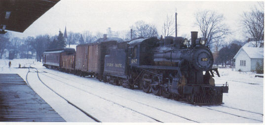 Mixed #606 with D-4g class 487 about to leave Bobcaygeon, December 29, 1954 R.J.Sandusky An early interest in getting a railway to serve Bobcaygeon where a sawmill had been operating since before 1846, came to nothing. Instead, they had to rely on tugs and barges working the extensive waterways of the Kawartha Lakes, including Trent Valley Transportation operated by the sawmill owners. It was about 50 years before they finally got a railway! A charter was granted March 28,1890 to the Lindsay, Bobcaygeon & Pontypool to build to a connection with the Ontario & Quebec, still nothing happened until 1901 when a small amount of roadbed construction was undertaken. Finally, in 1903 work got going in earnest when the CPR got involved and shortly the LB&P was leased to them, effective July 1st for 99 years. Track laying began in May 1904 and made Lindsay by June where a dispute with the GTR caused difficulty getting a right of way. It was secured; track work finished up in Bobcaygeon and the first train ran July 28,1904. Pontypool was chosen for a junction point with the Q&Q's mainline as a natural choice however, difficulty with terrain caused it to be changed to Burketon. It ran through Nestleton (Mile 5.9), Janetville (Mile 11.6), to Lindsay (Mile 22.5), Dunsford (Mile 30.8) and Bobcaygeon (Mile 38.7). Approaching Bobcaygeon a long trestle with a swing bridge always restricted the weight of locomotives used to a small D-4 class 4-6-0. An extension of about 20 miles to connect with the Irondale, Bancroft and Ottawa somewhere between Kinmount and Irondale never happened. In the end the line never amounted to much, maybe the CPR sensed this when they leased it for only 99 years instead of their normal choice of 999 years! The line consisted of 60-lb. rail made in Germany and Belgium rather than the usual choice of England. Enclosed 40,000 gal. water tanks were located at Burketon and Bobcaygeon, while Lindsay fed town water to a standpipe. Also at Lindsay was a 70' turntable, but no engine house; while at Bobcaygeon there was another 70' table and a small two-stall engine house. It was completed at a cost of a little over $16,000 per mile. The maximum grade was 1% northbound and .8% southbound. Early passenger service consisted of 2 roundtrips between Bobcaygeon and Burketon along with 1 roundtrip of a mixed train between Burketon and Lindsay. The last passenger train ran December 10,1932, following which the line was abandoned netween Burketon Jct. and Lindsay Jct. The May 1921 time table shows a daily ex Sunday mixed from Peterboro via Draneol to Lindsay over the old GB&S and on to Bobcaygeon. It then reversed direction back to Lindsay and continued on the LB&P to Burketon Jct. to North Toronto. The freight was taken to Lambton Yard, although it is likely in those days the conductor would carry a passenger to West Toronto. After North Toronto closed, Leaside was the end of passenger service. Later, service was provided by Daily except Sunday Mixed #605 and 606 operating from Peterboro to Lindsay and Bobcaygeon and making connections in both directions at Dranoel to and from Toronto, until October 26, 1957 when all branch passenger service ended. Freight service continued with steam until early 1959 with 434 being used in January and February only if required to run into Bobcaygeon, otherwise a D10 was used. 1088 made the last steam run from Havelock to Lindsay on March 1st. Beginning March 3rd trains 83 and 84 were hauled by 6591 a small yard switcher which was sufficient for the amount of freight remaining. Although, officially at least, restricted to 25 mph on the main track, the cleanliness and warm cab of the diesel was no doubt preferred, especially by the fireman! Note: There was one last run with steam on March 7, 1960, very near the end of all steam, when 2219 was dispatched in place of a yard diesel. At least it was a stoker-equipped engine! 2219 was a Smiths Falls assigned engine. A unique passenger service operated in earlier years to take Toronto residents to the Kawartha Lakes area in summer. Typical with other such summer cottage country Specials as the Bala Weekend and Winnipeg Beach trains was their weekend only schedule. Not so typical was the fact the train didn't return to its origin! Prior to 1950 most people worked at least a half day on Saturday, until 1 p.m. (stores were usually closed Wednesday afternoons back in those days too, but that is another story.) The Bobcaygeon Special left Toronto Union Station at 1 p.m. Saturday. When it returned Sunday evening it arrived at North Toronto Station! Why? Most people worked downtown, close to Union Station, while many (who could afford such luxuries) lived in the better residential areas of North Toronto. A unique solution to providing better service, at least until North Toronto closed.