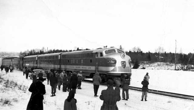 The Electromotive Division of General Motors delivered three F3 A-B-A demonstrator diesel-electric locomotives to Canadian National's Bonaventure Station in Montreal May 27, 1948. The units were tested in a variety of operating assignments, including the "International Limited," between Montreal, Toronto and Chicago. This is likely Pool 5 The Lasalle Montreal-Toronto (through to Chicago) depicted here with 754 leading making a crew change at Brockville (due at Noon). Note dynamometer car. Brockville Museum Train of Tomorrow