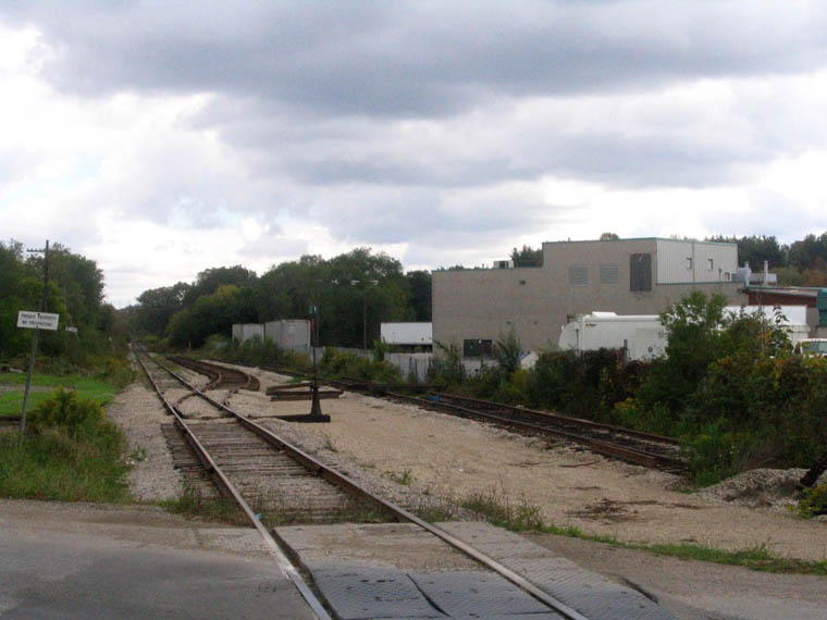 Looking south at York Road Mileage 30.09. New double-ended siding being constructed between main track and old Kaufman's siding Mileage 29.88 which was extended to a stop block at far right. Mileage board 30.0 at left behind No Trespassing sign. From there northward a permanent speed restriction of 10 mph and no whistling has existed for many years. Building at the right is a shopping plaza behind which is hidden the former Huntsman (old Hart Chemical) plant on Victoria Road South , now the new liquid transload facility of PDI at Mileage 29.78 September 29, 2006 David Young