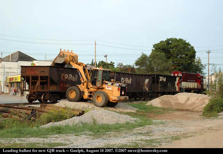 Work train with 182 and three ex CP long (longitudinal) hoppers is ballasting the new runaround track. |