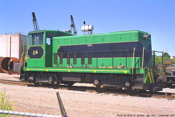 OSR provides a locomotive for the large Babcock and Wilcox boiler plant in Cambridge, (formerly Galt) Ontario. This unit is a GE 70-tonner, L4 formerly used at PSTR (although always privately owned). This unit has a long and interesting history being built in October 1946 as the second 70-tonner for a small shortline in New York, Saratoga & Schuylerville 4, the unit became in November 1954 Claremont & Concord 11; then Montpelier & Barre 23; Hoosac Tunnel & Wilmington ("Hoot, Toot & Whistle") 23. These were all Pinsly owned shortlines. It was sold in November 1960 to the New York City Transit Authority (MTA) in South Brooklyn as 13 (re# 20009 and back to 13). Sold again in November 1981 through George R. Silcott (Dealer) it came to Canada arriving in December at Thurso Pulp & Paper (parent company of the non-common carrier railway Thurso & Nation Valley) as their 13 (2nd). It was re-engined in 1983 with a Cummins 600 HP truck engine. Interestingly enough, T&NV once owned the first GE 70-tonner, demonstrator 7001 built 5, 1946 and sold October 1946 to Singer Manufacturing Co. parent of the T&NV. It became T&NV 5 and went to Canada & Gulf Terminal in 1949 in exchange for their 44-tonner 355, which became T&NV 8.