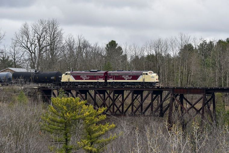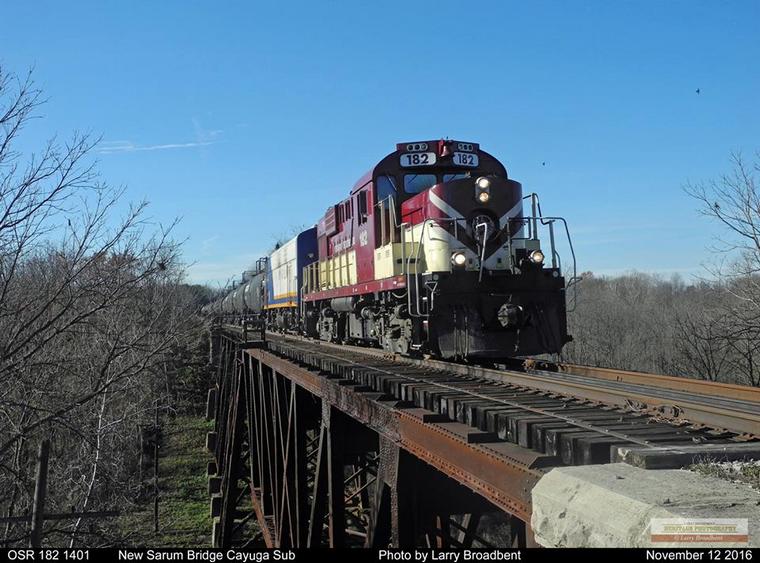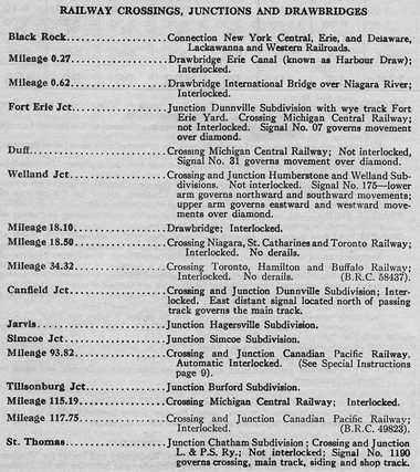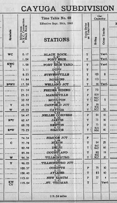 customers in Tillsonburg (east of the bridge) and Courtland. Short term arrangements were renewed a number of times while CN sought another operator in the interim OSR continues to operate part of the line recently adding St.Thomas to Aylmer. Major repairs to the embargoed trestle Mile 94.6 just west of Tillsonburg yard undertaken by CN during 2016 in order to reopen line. The first train operated early in 2017 from CN St.Thomas to Tillsonburg over the trestle. This one trestle cost $640,000 dollars while extensive track work replacing 6,000 ties cost another $900,000 in addition to another 3800 ties put in by OSR mostly between St. Thomas and Aylmer all carried out earlier in 2016. This eliminated the long-existing 10 mph track speed bringing it up to varying speed up to 25 MPH. A stretch of excellent CWR previously laid also exists. The line was reopened with the promise of a consider volume of long-haul freight from Tillsonburg to Western Canada. This traffic was intended to be windmill blades. However, the much larger size blades required were too big to be produced in the former auto parts leased plant by the same company (Siemens) that had built smaller blades for Samsung's Ontario windmill farms. The plant promptly closed in early 2018. OSR continued providing service in spite of declining freight traffic with little or no possibility of reversing the trend. Finally, it was decided to end operations and the last train operated Thursday, April 30, 2020. CN will not resume operation. St.Thomas Running rights granted on the Cayuga spur Mile 114.55 to Mile 119.0 in St.Thomas to reach CN St.Thomas Flora Street yard for interchange with CN (Talbot Spur going 14.5 miles to London.) This is the former London and Port Stanley radial railway. The connection to CPR St.Thomas Subdivision remains.