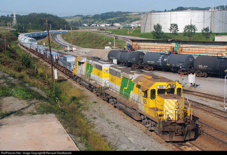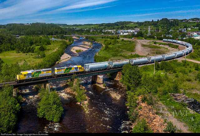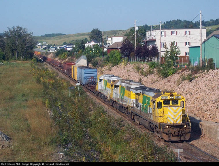 Alcan plant at Port Alfred, Quebec. September 12, 2003 Renaud Chodkowski Aerial view of Rio Tinto facility Port Alfred, M.18.25 Arpa Sub. August 13, 2016 Aerial view of roundhouse and plant area. The Roberval and Saguenay Railway Company is owned by Rio Tinto Alcan (previously Alcan Aluminium Ltd.) to serve its four smelters, alumina refinery, petroleum coke calcining plant and port, as well as other primarily forestry-based industries including the newsprint mill in Alma built by the Price Bros. in the 1920's and the mill in Kenogami in the Saguenay region. There are two isolated subdivision; the mainline 19 mile ARPA Subdivision between Port Alfred and Arvida, and the 10 mile Alma Subdivision between Saguenay Power and Alma. The R&S was granted running rights over the CN between Saguenay Power and Arvida in the fall of 1975. In the mid-1990's this agreement was changed. R&S gave up running rights in turn for switching CN's customers in Arvida and the CN moves cars between Arvida and Saguenay Power (at St. Bruno) once a day in each direction. Interchange is performed at Saguenay Power and Arvida. R&S running rights now are limited to light engine moves to get units assigned to the Alma Sub. to the Arvida shops. The Roberval and Saguenay had its beginnings with the Quebec incorporation in 1908 of the most unusually named Ha! Ha! Bay Railway to build from Jonquieres to Bagotville on Ha! Ha! Bay, with branches to Chicoutimi Pulp Company mills, to Lake Kenogami and St.Alexis. The R&S itself was incorporated in Quebec in 1911 to build from Roberval on the Quebec and Lake St. John Ry. around Lake St. John to rejoin the Quebec & Lake St.John at Chicoutimi and also at St.Bruno via a branch. It bought the Ha! Ha! Bay June 28, 1914.