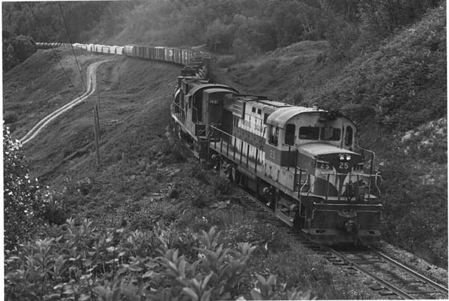 of the Roster Roberval Saguenay in common with many shortlines operated with used locomotives, some often acquired from the contractor who built the line. In addition to some small steam locomotives R-S had a number of trolley pole electric locomotives of a typical early design. More steam locomotives filled the small roster until the first diesel came along early in 1941. Number 18 was a 50-ton Whitcomb center-cab with twin Hercules engines. A single Alco S-2 followed in 1943, marked for parent Aluminum Company of Canada. In 1947, a single Alco RS-2, 19, was added to the roster, followed two years later by number 20, now being built in Canada by MLW. It was the first road switcher built by MLW and as such it was preserved by the CRHA. The number 21 was given to former Alcan 72-359 the S-2 above. An RS-3, 22, followed in 1955. A new RS-18 came along in 1960 and another in 1965, a low nose unit. A power shortage during 1969-1972 was filled by some leased CNR RS-18's and two MLW leasers 675 and 676, RS-27's. After a pause of several years two new units were bought in April 1972. These were a unique new model by MLW the M420TR, a 2000HP "transfer" unit designed like a switcher with road trucks. Alcan bought the only two units of this model! (A newer model sold only to Mexico.) Lettered for parent Alcan, they were in the same number series, 26 and 27. These were the last new locomotives bought for more than twenty years. The used locomotive market was turned to for needs the following year when four RS-3's were acquired, two ex D&H and two ex RDG. After two years a used RS-11 ex SP was acquired followed by 9 C-420's all ex LIRR. All of these units would have cost far less than one new unit However, they turned to new units once again, this time from GE since MLW was out of business. GE provided some leased demonstrator units in 1993. These were B23-7S (Super Series) remanufactured from U23B units. It was a way for GE to provide medium horsepower four axle units at less than the cost of brand new yet thoroughly renewed rather than just rebuilt. The program met with limited success, in Canada Roberval & Saguenay was the only taker. At the time, GE had a presence in Canada at the former MLW plant in Montreal, although these units were produced in Erie. GE was unable to get sufficient orders for new units and soon left Canada. BC Rail having been the only major customer and this was for just 22 units. This was before the success of AC powered units. When next power was required they turned to AMF in Montreal for remanufactured GM units. This time GP40's (4 ex CN and 3 ex KCS/IC) were rebuilt into GP38-2's and the 7 units were delivered mostly in 1997. Alma & Jonquieres was absorbed by Roberval & Saguenay January 1, 1974. It had two used steam locomotives which were replaced by two new diesels, one in 1949 and one in 1951, both MLW S-4's. Gallery of electric and steam locomotives 22 inside shop. 8/15/1969 Tiny number 8 has lots of room on the turntable! 8/15/1969