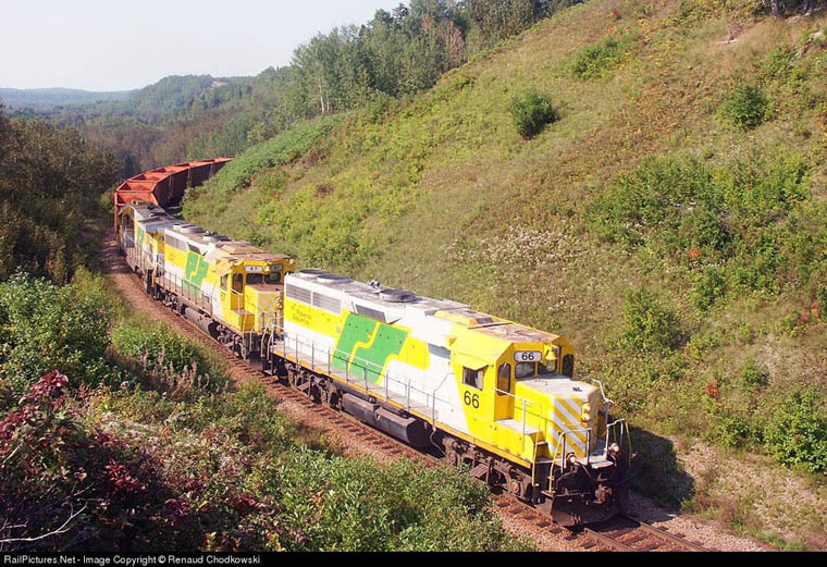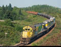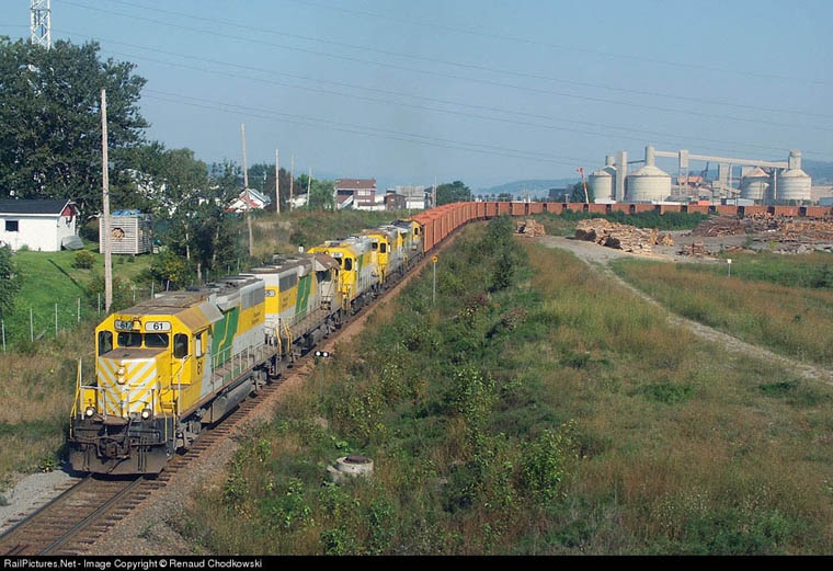 GP38-3's 61 and 65 crossing Riviere-a-Mars, La Baie. June