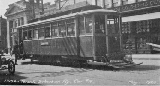Toronto Suburban Railway The Toronto Suburban Street Railway Company Limited was incorporated in February 1894 to acquire the City & Suburban and the Davenport Street Railway companies. Its name was abbreviated in 1900 to Toronto Suburban Railway Company. The Royce family led by Allan H. Royce a barrister and resident of Davenport took control from the original shareholders until they sold out in 1911 to Mackenzie, Mann and Company who bought it primarily for the railway charters it held. Mackenzie owned the Toronto Railway Company which provided service in Toronto, Toronto and York Radial Railway which operated suburban and interurban lines out of Toronto including the former Toronto and Mimico Railway and Light Company and the former Toronto and Scarborough Electric Railway, Light and Power Company as well as the lengthy line from North Toronto to Lake Simcoe of the former Metropolitan Street Railway Company. In addition they owned the Canadian Northern Railway an extensive steam railway running out of Toronto east to Ottawa and north all the way to British Columbia! Toronto Suburban lines used the old Toronto horse car track gauge of 4 feet 10 and 3/4 inches designed to allow horse drawn wagons to ride along the rails avoiding rutting the dirt streets. This was changed January 30, 1917 to standard gauge (4 feet, 8 and one half inches) in connection with the construction of the Guelph radial line. It was opposed by the City of Toronto over fears freight cars would be hauled along the streets however, the railway prevailed and no freight was ever hauled on streets. Map of Local Lines Time Table 1918 Local Lines