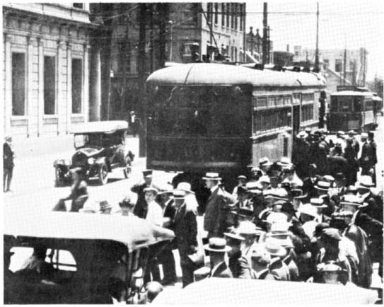 Guelph radial car loading on Keele (looking south). TRC car on south side of Dundas sitting on wye, it will turn west. 1919
