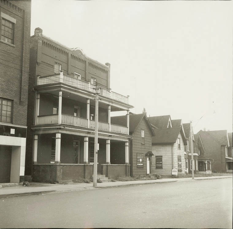 Robinson house on Mavety Street (One block west of Keele Street) east side just south of Dundas. At various times an apartment building and a meeting hall, it was also a boarding house known as the "Dog and Pot" and said to be used by railwaymen. September 1956. Toronto Public Library/James R. Robinson Once a smallpox epidemic started here and medical authorities quarantined and used it as an isolation hospital. Note: Dog and Pot refers ironmonger's sign of an indiron, commonly called a fire dog, and a cooking pot.
