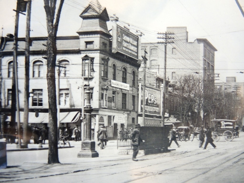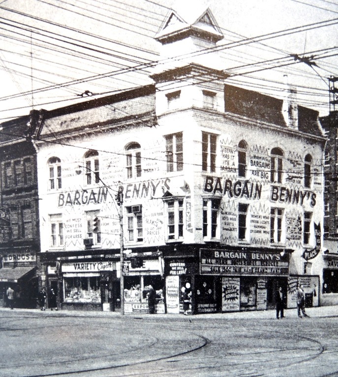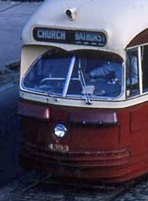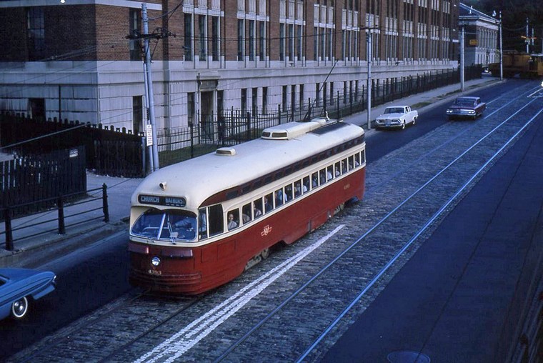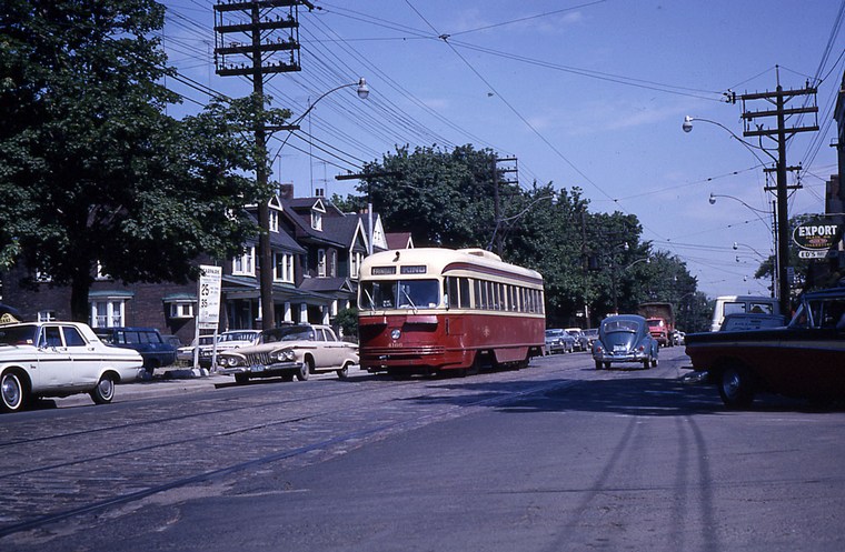 PCC 4166 an eastbound King car signed for Erindale loop at Broadview Avenue and Danforth Avenue. Still the same route today! Tracks were set in cobblestones for durability. These were the days when automobiles were easily identified by sight. Can you name any? Export was a major brand of cigarettes. December 1964 (and no snow?) Paul McGrane Collection